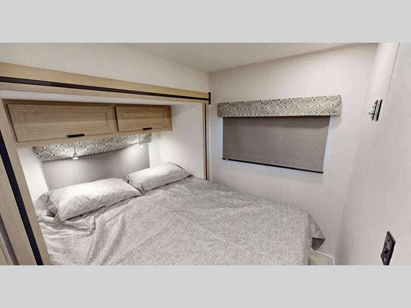 The exterior consists of a fiberglass roof, a one-piece seamless fiberglass cap, slide-out awnings, an integrated entry step, and 2"aluminum framed lamited sidewalls with lightweight composite waterproof material. The sideview and backup cameras will help you park your coach, and the high-pressure oxygen-infused shower head will give you a pleasant shower experience. You'll also have a Maxx Air multi-speed power fan with cover in the kitchen, and another kitchen feature you'll love is the 1.3-cubic foot convection microwave. You also have the ability to add an optional solar-powered 12V charging system.