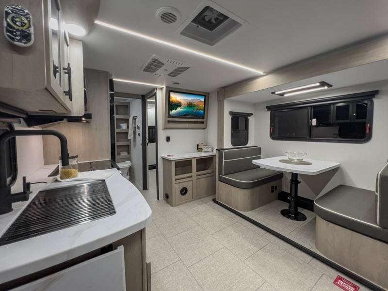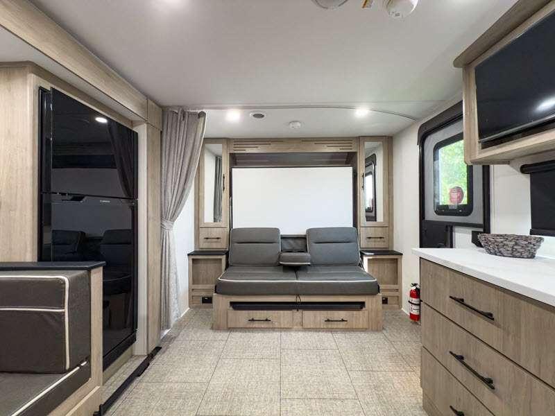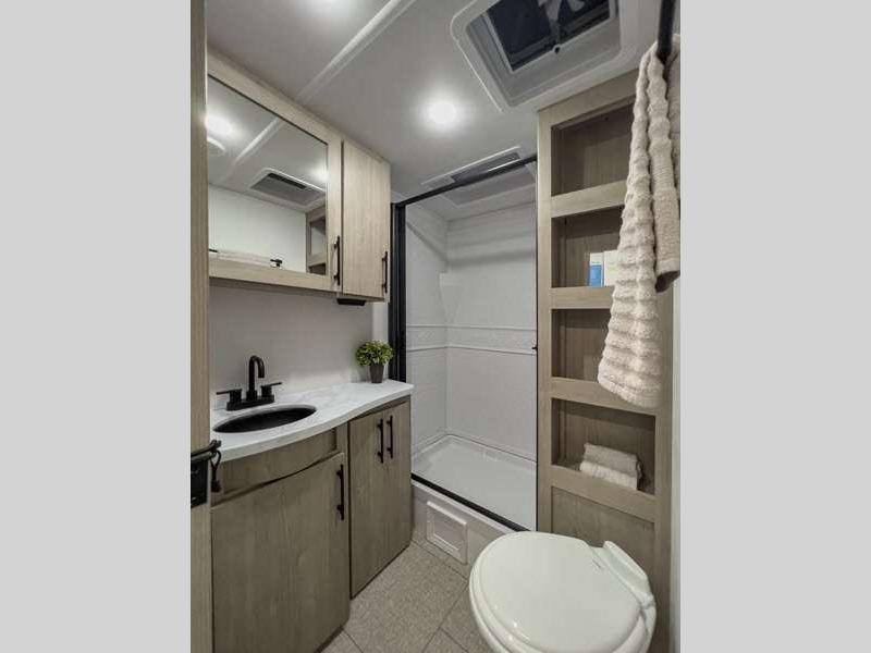 The gel-coated fiberglass exterior and one-piece roof membrane form the base that holds all of the many features, like the three-burner range with an oven, residential walk-in shower, high capacity furnace, and LED HDTV. The friction-hinge entry door won't fly away when you open it, and the residential countertops will let you set down dinner plates. There is a large panoramic window and LED lighting to keep your trailer feeling open, and the four packages included will provide even more features you won't want to camp without. Some of these features include a 200W solar panel, an accessory hitch, and a full width pass-thru storage!