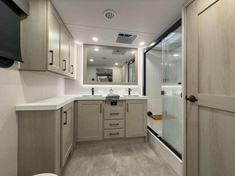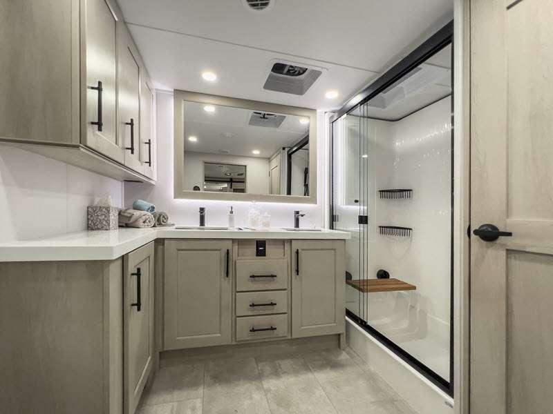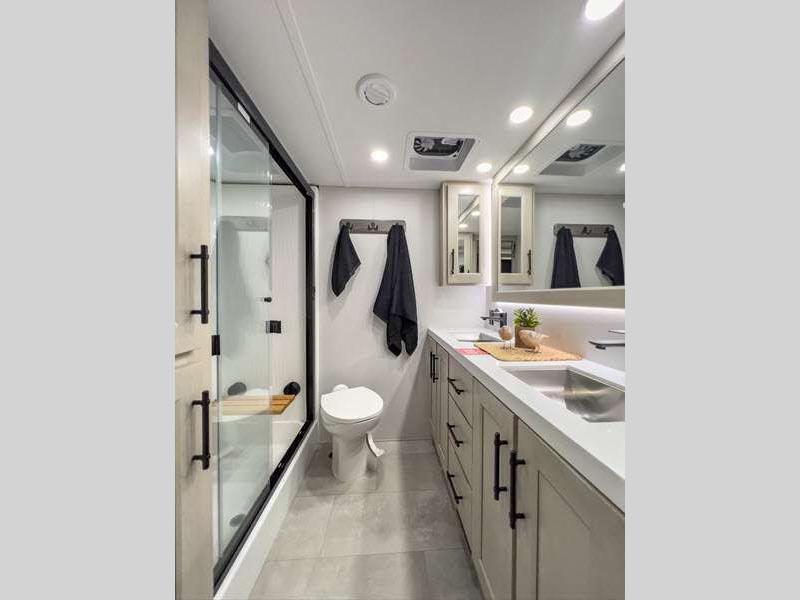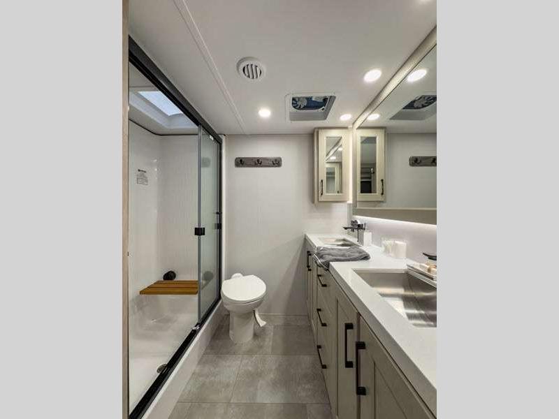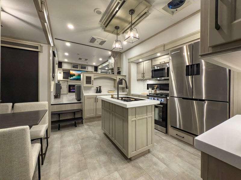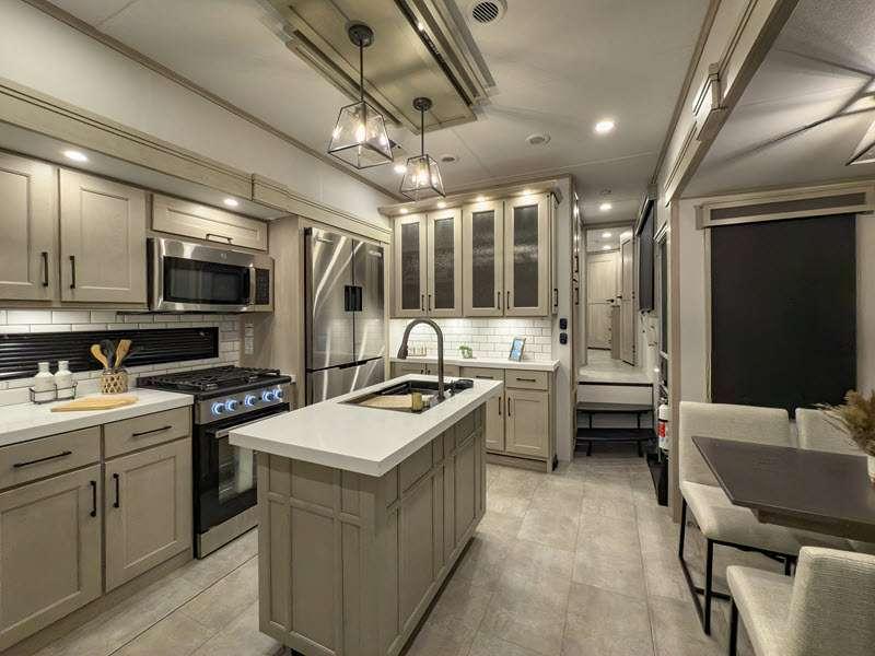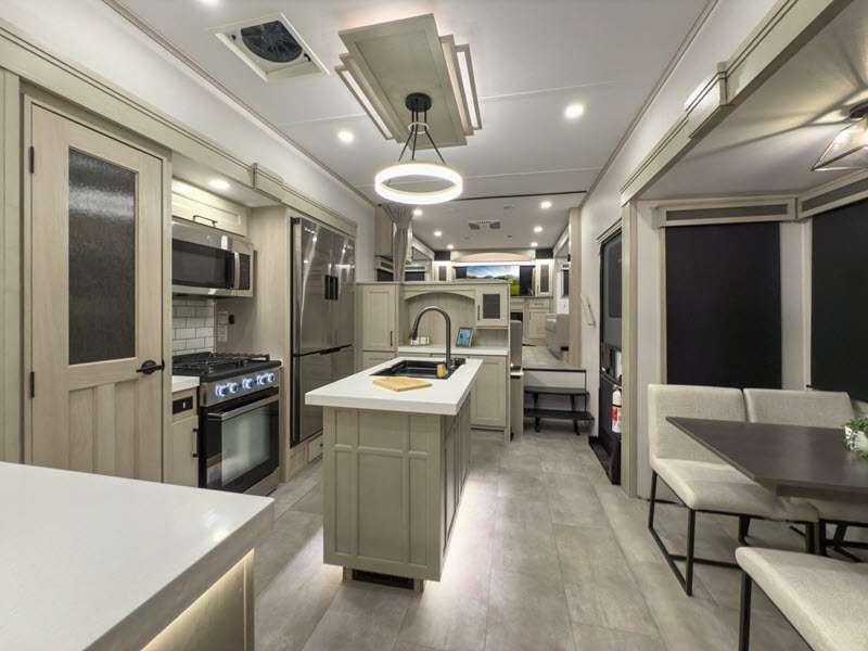 Each is built on a 101" wide body drop-frame super chassis, and includes the MORryde pin box system that utilizes a unique rubber shear spring to positively deal with rough towing and road shock. Some standard features that stand out include the chef-inspired professional grade stainless steel cooktop and Smart sink with a removeable cutting board, produce strainer and glass rinser, and the on-demand water heater with a whole house water filtration system. There is also an all-in-one enclosed and heated utility center to enjoy four seasons of camping, plus many more comforts.