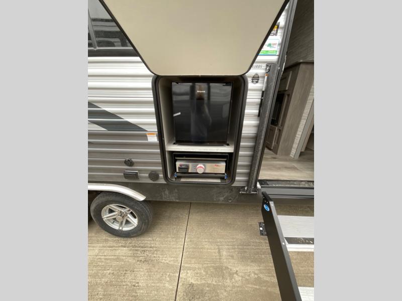 This popular trailer is easy to pull and park, and is spacious thanks to the large slide out in the main living and kitchen area! You can dine at the booth dinette or choose the free standing dinette option, and the Sit-Lounge-Sleep sofa offers a place to relax and have guests stay over. There is also an entertainment center and an optional fireplace if you'd like to make your space more cozy. The rear corner offers a full bathroom, and a large wardrobe/pantry for the storage you need. The galley kitchen offers full amenities plus ample counter space where you can set out fresh fruit and cereal. This model also includes an exterior camper kitchen with a griddle and mini refrigerator!