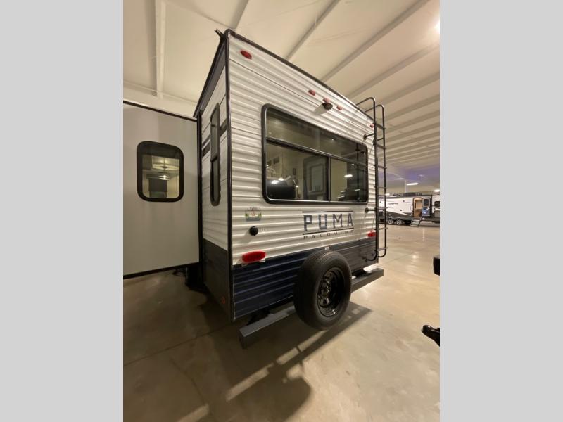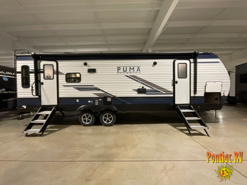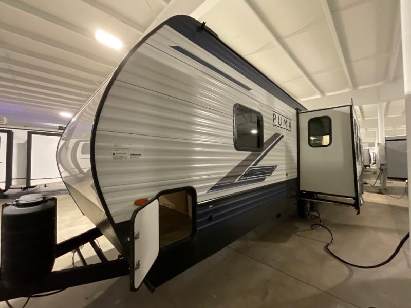 If you're looking for family-fun adventure then you need one of these Palomino Puma fifth wheels or travel trailers! They are built rugged, easy to tow, and jam packed with features. The Darco wrapped underbelly will protect your units vitals through every season and the AlphaPly roofing membrane covers it. They also have super lube axles and a powder coated frame. Their luxurious interiors feature a spice rack and built-in knife rack in the kitchen, USB charging ports to keep your electronics at 100%, and high density foam mattresses for a good night's rest. The required Advantage package comes with night roller shades for privacy at night, two outside speakers to crank up the tunes while you play cornhole, and an outside shower to keep the dirt outside where it belongs, plus so much more!