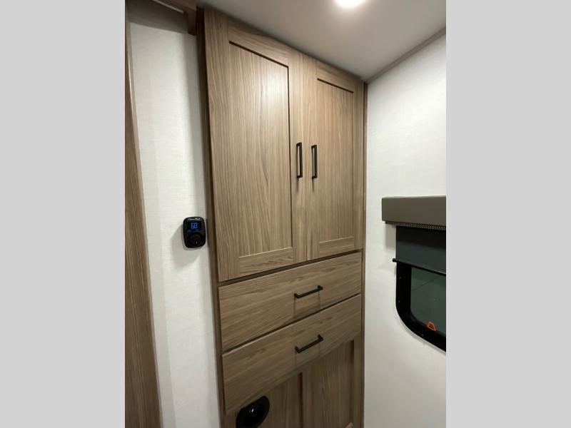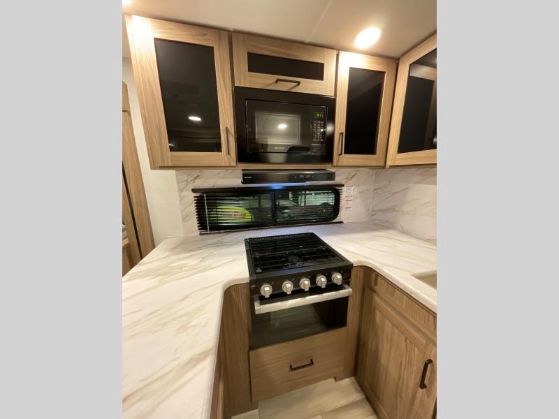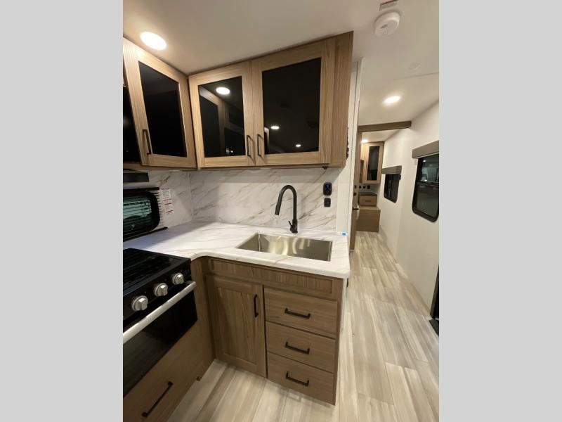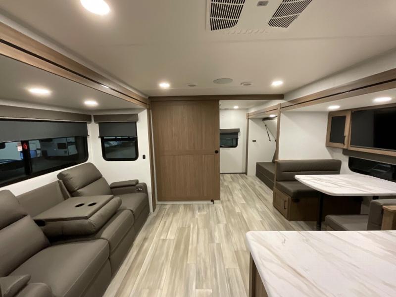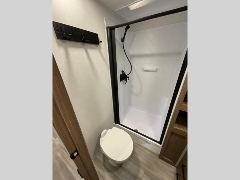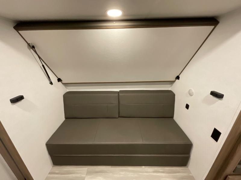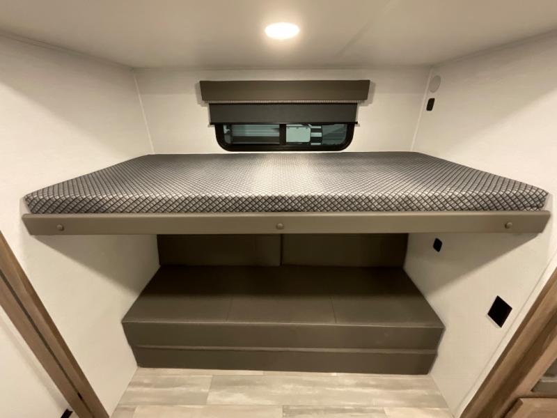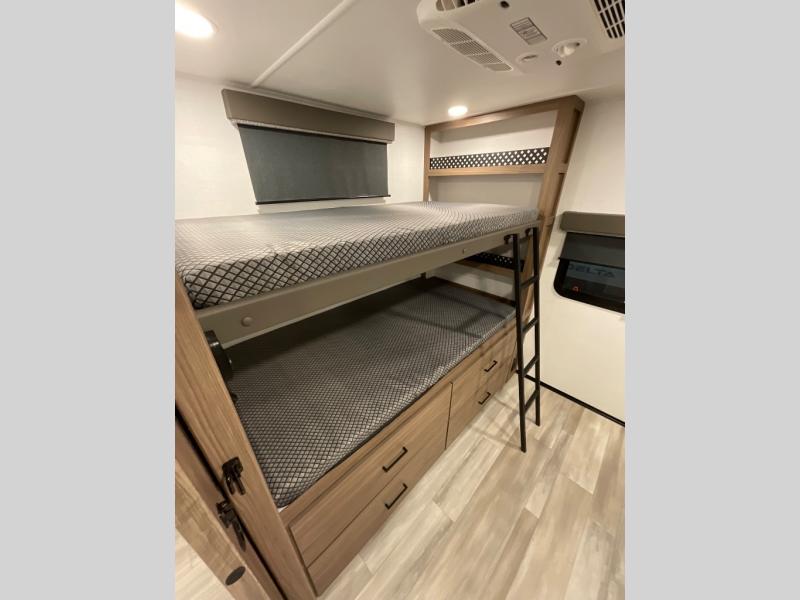 Enjoy glamping in this spacious travel trailer for eight! Your guests or the kids will love the rear bunkhouse with 40" x 72" bunk beds across from a third bunk with a cube sofa below, and the slide out will make this space more open. The slide out also includes the booth dinette in the main living area, which is across from the sofa slide out. The chef will love cooking in this Delta kitchen with generous counter space, a 10 cu. ft. 12V refrigerator, plus pull-out pantry trays for dry goods and snacks. The full bath with a 30" x 36" shower and a soft close porcelain foot flush toilet will allow you to fresh up each day without having to use the camp's facilities. And don't overlook the front private bedroom with a queen bed, wardrobe nightstands, a third wardrobe plus overhead storage; now nothing has to get left behind!