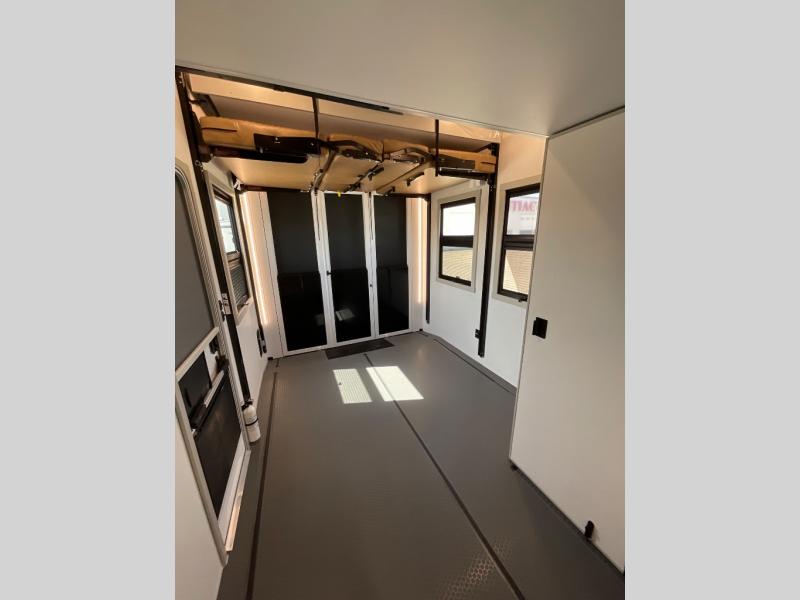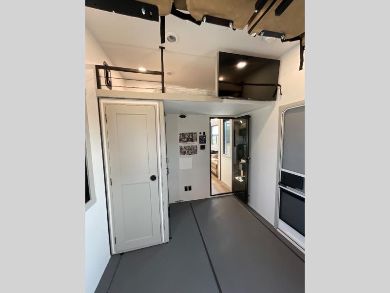 The front bedroom is a serene retreat, featuring a plush king bed, spacious walk-in closet, 32” smart TV, sliding dresser top, and hidden storage for better organization.The bathroom is a haven of convenience, boasting a full bathroom with pull-out linen and trash bin, and a spacious 30 x 42 shower. Perfect for freshening up after a long day of adventure! The kitchen has a pantry featuring adjustable shelving, a hutch, 19 cu. refrigerator, microwave, four-burner cooktop, kitchen island, and convertible dining table/L-desk. Plus, pet bowls for your furry friends! Gather with family and friends in the living room, which features a dual sofa with two recliners, each with heat and massage functions, a televator, and a cozy fireplace. It's the perfect spot to relax and unwind! The garage has a half bathroom, two sofas, and a 43” smart TV, ideal for game days, movie nights, or just relaxing with friends. Outside, enjoy the convenience of a fuel station, three-way pass-thru storage, and LP quick connect. Whether you're an adventure-seeker, or just love to travel in style, this toy hauler has everything you need and more!