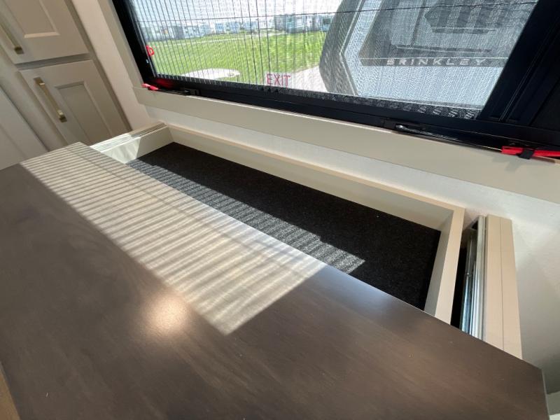 With any Model G toy hauler fifth wheel by Brinkley you will enjoy luxurious amenities, tons of storage space, and innovative features that have been developed and tested in the real world. Durable construction includes an industry leading PDI process, an industry best insulation package, and reinforced and walkable slide roofs. Some of the exterior features you'll find are a 3-way pass-through with a multi-functional flip-up bulkhead wall, under I-beam storage, a MAX-Vision reverse lighting system, and a low-maintenance roof to name a few. A Rockford Fosgate audio system comes standard, along with a OneControl app system that lets you control your fifth wheel's functions right from your mobile device. You will find the solar system with a designated storage area to be ultra convenient, plus there is a FlexPower 5500 with a dual fuel inverter generator for all your power needs. Head inside to find a residential interior with Brinkley's CraftSense wood trim construction, floating entrance steps, integrated window screens and insulated blackout blinds, and residential solid surface countertops plus backsplash. You will also enjoy the neon shower lighting and recessed medicine cabinets in the bath, plus motion activated LED bed lights and dual bedside outlets in the bedroom. Choose a Model G toy hauler fifth wheel to experience all the luxury it has to offer!