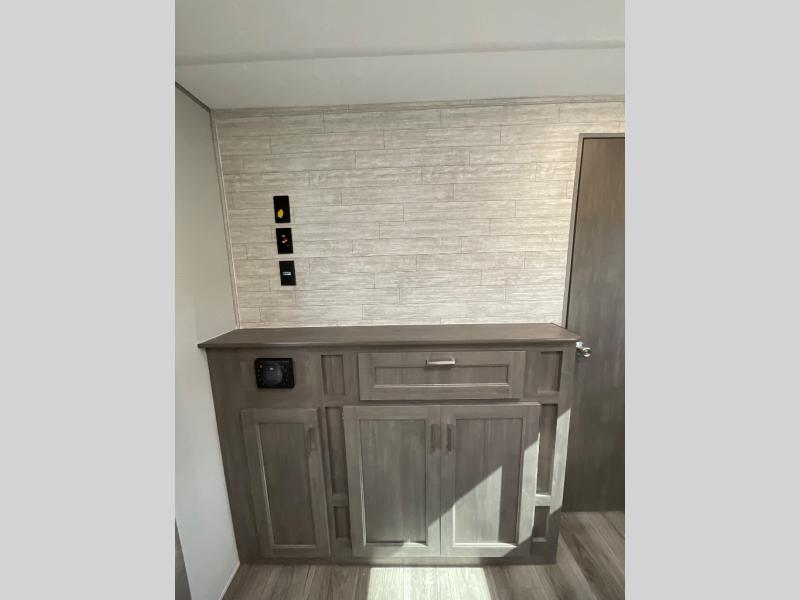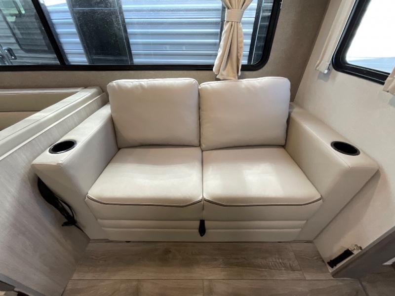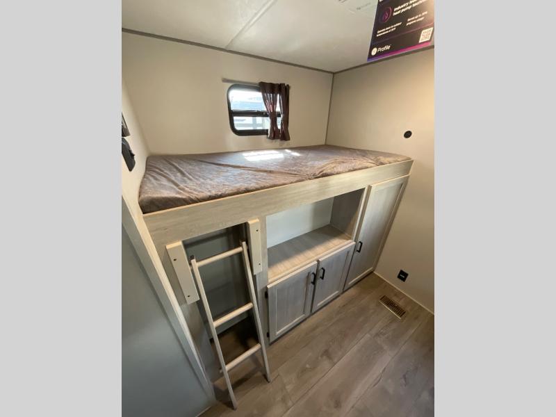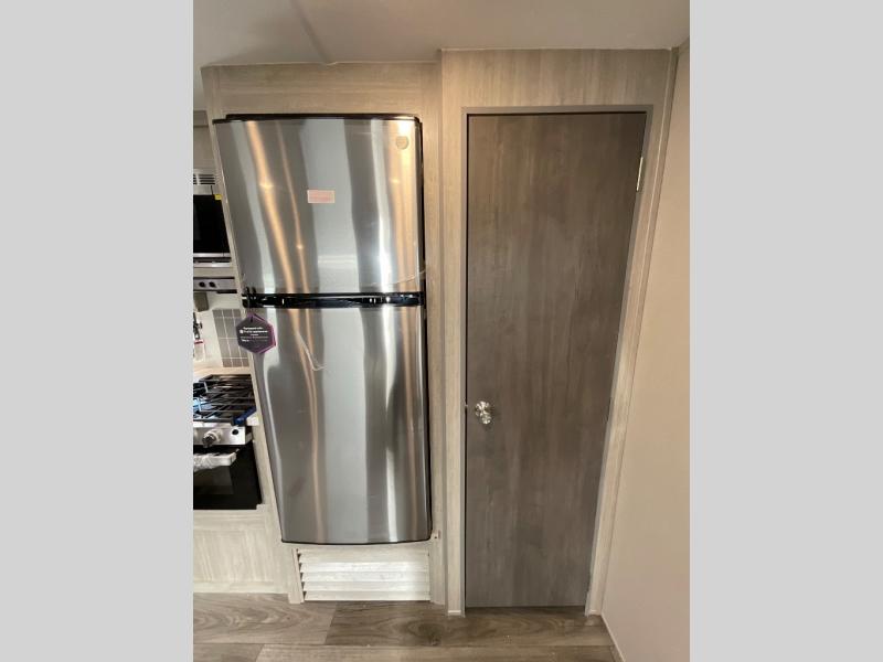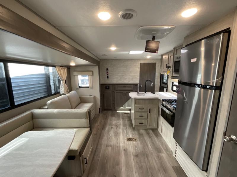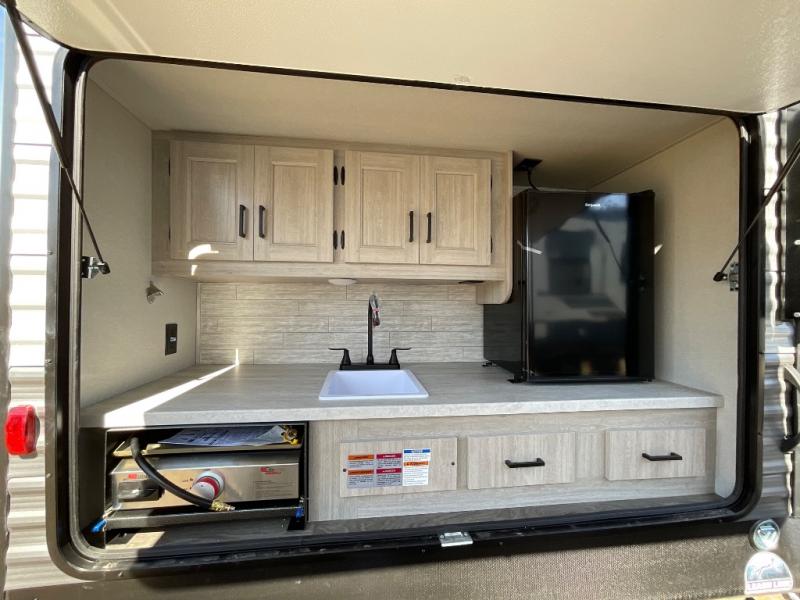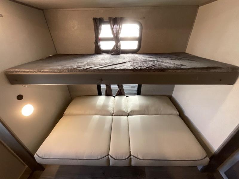 If you enjoy hiking, biking, and fishing, and waking up to beautiful scenery from your own comforts, then start camping with this trailer at the campsite! You will be able to sleep like a queen on the walk-around bed with dual wardrobes and overhead storage for more items in the front private bedroom while your family or friends have their own privacy in the bunkhouse complete with two bunks, a jack knife sofa with storage totes below and a TV/wardrobe cabinet for even more storage. The full bathroom includes the second entry/exit door for convenience when outside under the 21' electric awning with multicolor LED lights, or while cooking using the full size camper kitchen along the exterior. There are full kitchen amenities inside including a 10 cu. ft. refrigerator and a pantry.