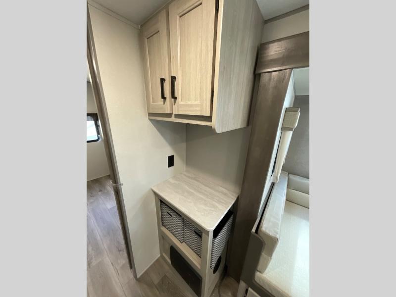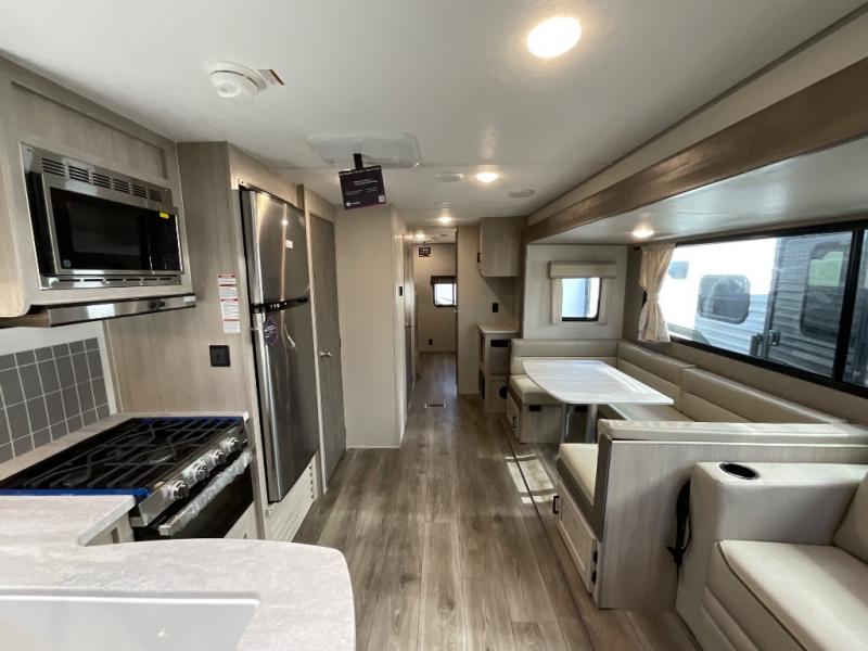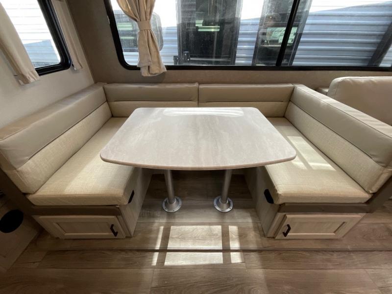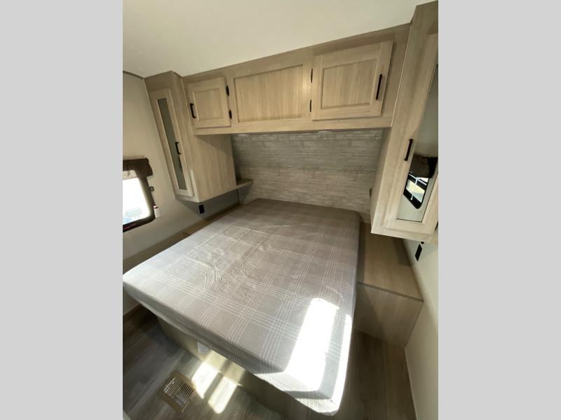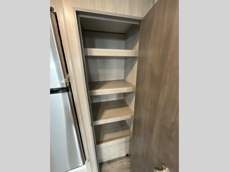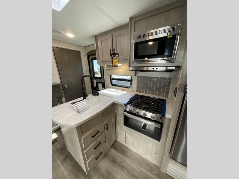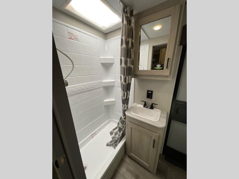 If you enjoy hiking, biking, and fishing, and waking up to beautiful scenery from your own comforts, then start camping with this trailer at the campsite! You will be able to sleep like a queen on the walk-around bed with dual wardrobes and overhead storage for more items in the front private bedroom while your family or friends have their own privacy in the bunkhouse complete with two bunks, a jack knife sofa with storage totes below and a TV/wardrobe cabinet for even more storage. The full bathroom includes the second entry/exit door for convenience when outside under the 21' electric awning with multicolor LED lights, or while cooking using the full size camper kitchen along the exterior. There are full kitchen amenities inside including a 10 cu. ft. refrigerator and a pantry.