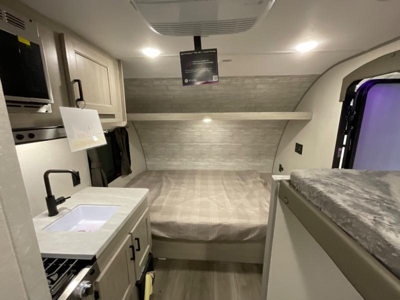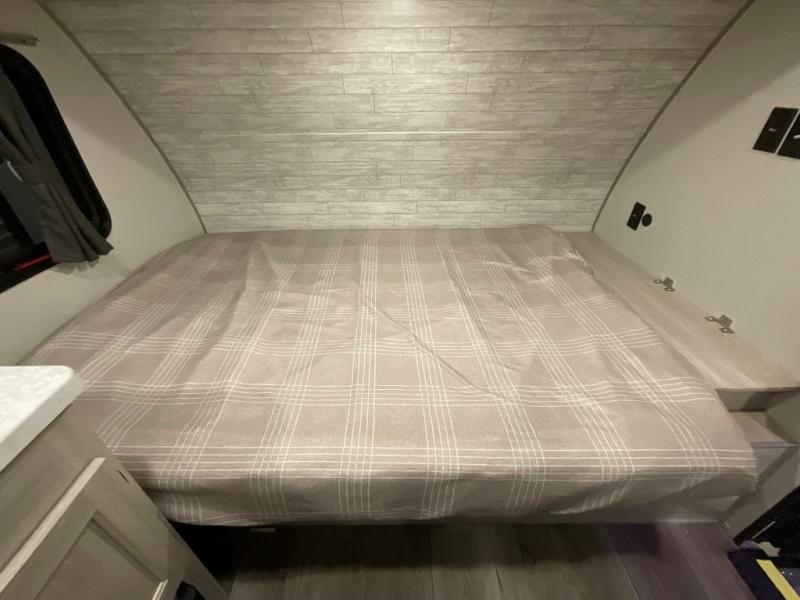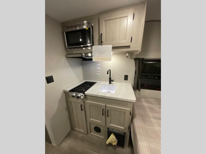 Lightweight camping is easier than you think with this travel trailer in tow! The front 54" x 74" queen bed will provide a great night's rest each night, while the little ones or your guests take the bunk beds. There is a handy shelf above the front bed for your belongings plus additional bedroom storage. A private bath includes a 24" x 32" shower and a toilet with a mirror behind it so you can freshen up each day. You'll also find a two burner cooktop and microwave oven to make meals each day plus a 3.3 cu. ft. 12V refrigerator for food storage!
