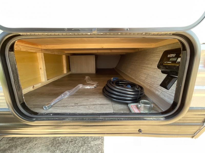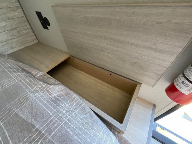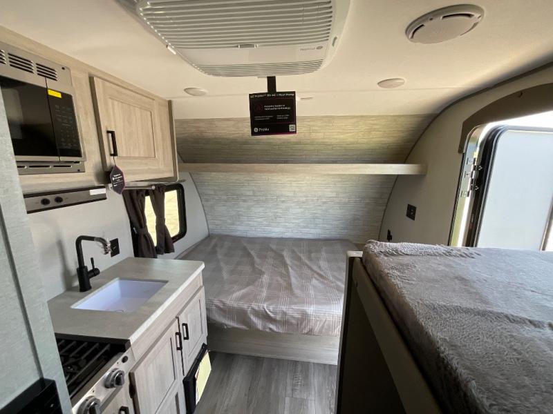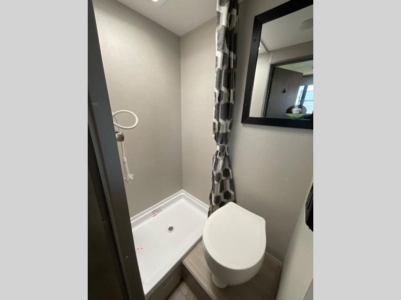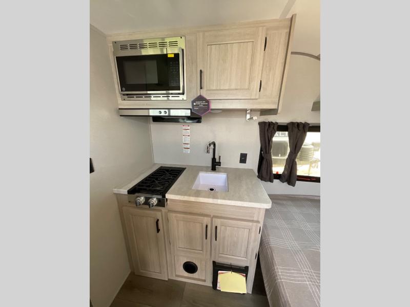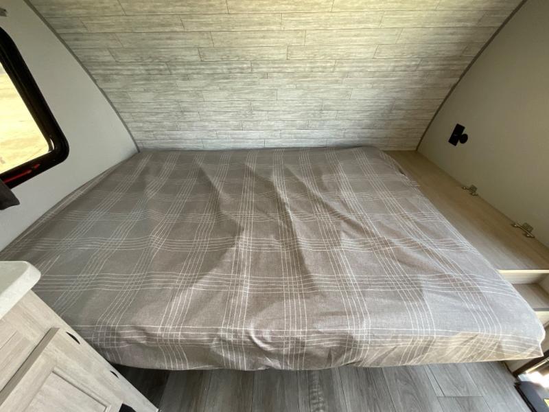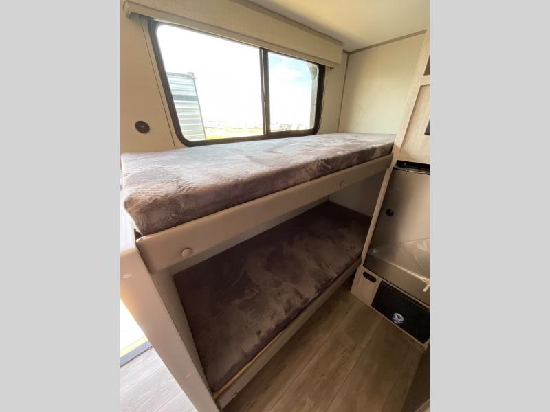 Lightweight camping is easier than you think with this travel trailer in tow! The front 54" x 74" queen bed will provide a great night's rest each night, while the little ones or your guests take the bunk beds. There is a handy shelf above the front bed for your belongings plus additional bedroom storage. A private bath includes a 24" x 32" shower and a toilet with a mirror behind it so you can freshen up each day. You'll also find a two burner cooktop and microwave oven to make meals each day plus a 3.3 cu. ft. 12V refrigerator for food storage!