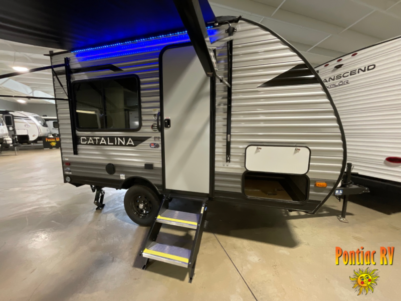 With any Catalina Summit Series 7' by Coachmen RV, you can create an easier adventure with the versatility and simplicity of the shorter lengths and lighter weights! Each includes a premium exterior graphics package, a smooth HD aluminum radius front, and EZ lube axles with leaf spring suspension. The exterior offers a heavy duty standard tongue jack, a diamond plate rock guard to protect against road debris, exterior RG-6 coax cabling and satellite prep, rear view camera prep, and flush mount baggage doors with radius corners for your outdoor gear. Inside, you will enjoy a premium JBL interior speaker, USB charging ports, seamless Thermofoil countertops throughout, a deep basin farm style sink for easy cleanup, and GE kitchen appliances. It's time to choose an affordable and maneuverable single axle trailer today!