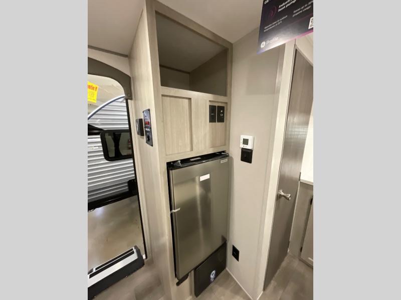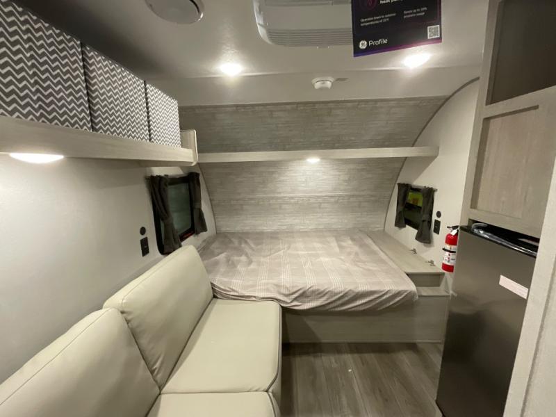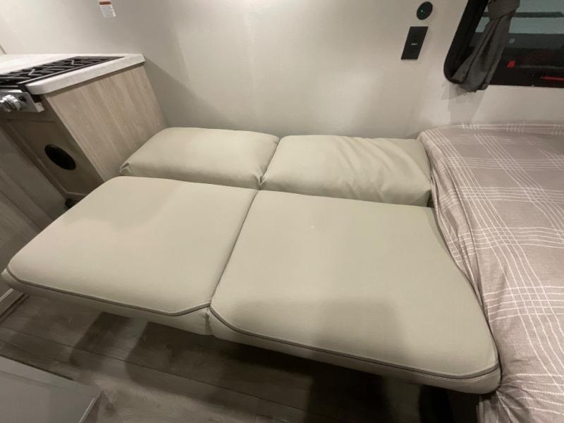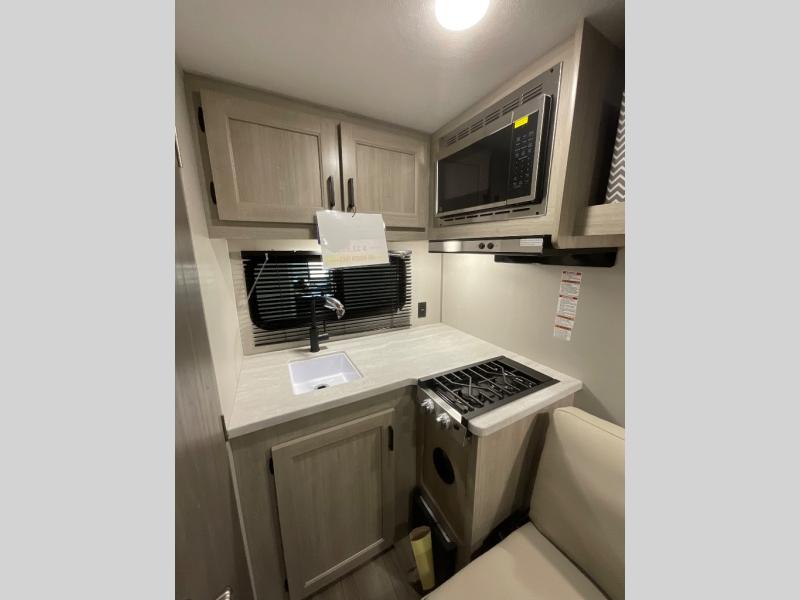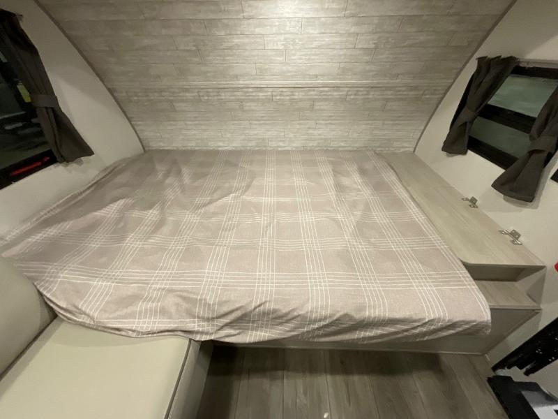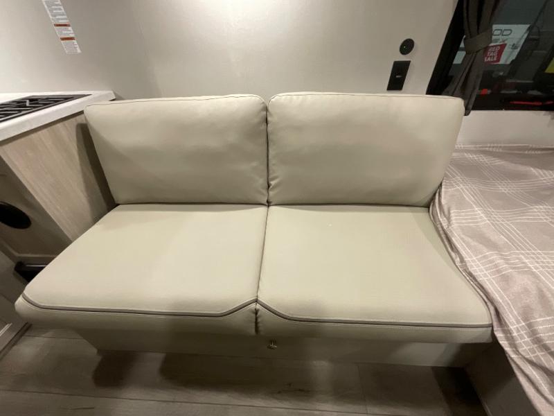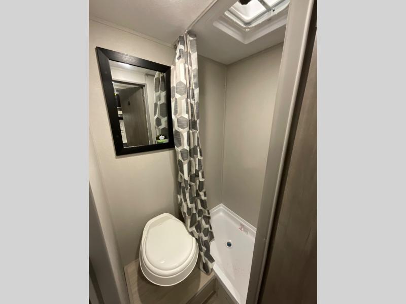 Lightweight camping is easier than you think with this travel trailer in tow! The front 54" x 74" queen bed will provide a great night's rest each night, while your overnight guest takes the 60" Jack knife sofa. There is a handy shelf above the front bed for your belongings plus a shelf with bins over the sofa. A private bath includes a 24" x 32" shower and a toilet with a mirror behind it so you can freshen up each day. You'll also find a two burner cooktop and microwave oven to make meals each day plus a 3.3 cu. ft. 12V refrigerator for food storage!