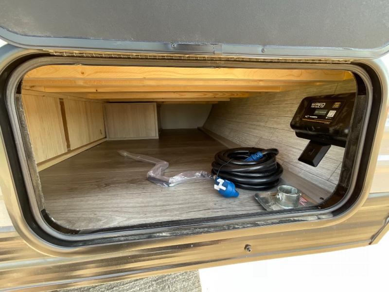This couple's trailer will be perfect for all your outdoor adventures! There is a 60" x 74" Murphy bed up front with dual nightstands to keep your things tidy, and in the morning, you can fold up the bed to relax on the sofa. The bar top with two stools also includes storage below, plus there is a pantry and overhead storage for even more storage space. A full rear bath includes a 36" x 30" shower, a 12V 14" bath power vent fan, a marine toilet with foot flush, plus a linen closet to keep clean towels close by. This model also includes full kitchen amenities, including a GE two burner cooktop, a GE stainless microwave oven, plus a 3.3 cu. ft. 12V refrigerator to keep food fresh!