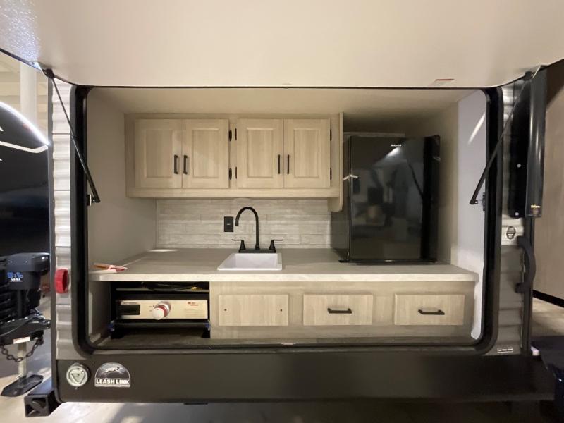 If you enjoy camping with family or a larger friend group, this trailer is sure to meet your needs! The rear private bunkhouse includes single-size bunks plus double-size bunks, allowing you to sleep up to six here alone! You'll have the 60" x 74" RV queen bed all to yourselves in the front master bedroom, and any additional guests can sleep on the U-shaped dinette and sofa within the large slide out. The chef of your group can use the GE stainless three burner cooktop or microwave oven to create meals each day, and an optional full-size exterior camp kitchen can be added if you enjoy cooking outdoors. The optional exterior kitchen replaces the lower bunk. A walk-in pantry includes washer and dryer prep if you choose to add these appliances, and everyone can stay clean all week thanks to the dual entry full bath!