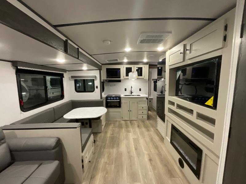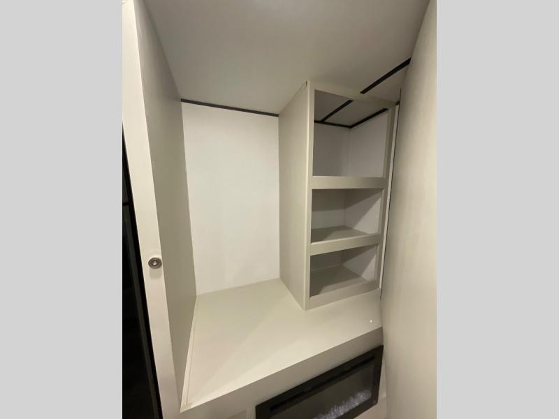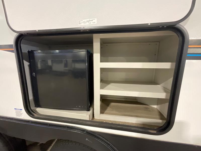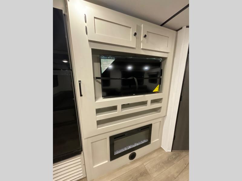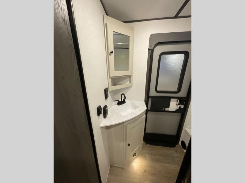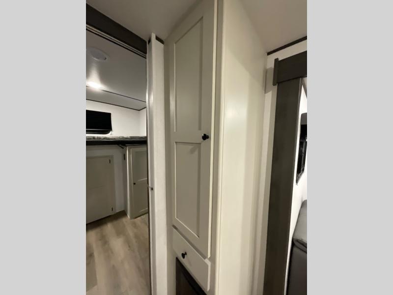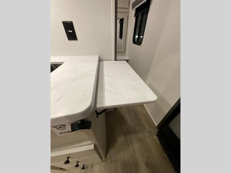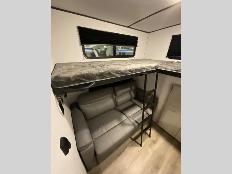 This travel trailer will be perfect to see family and friends in other states or camping for long-periods of time. There is an abundant amount of storage in the living and kitchen area, including behind the entertainment center in the hidden pantry and the second pantry with shelves, plus in the front bedroom under the queen bed with the MAX bed storage system. There is even storage in the rear private bunkhouse cabinet and countertop, plus along the exterior in the pass-through compartment and the Stor-More Cargo in the rear. The side Stor-More cargo door leads you into the bunkhouse to stow items like bikes and totes during travel. You will also love making meals in the kitchen with full amenities including a 10 cu. ft. refrigerator, and outside using the camp kitchen. And having dual entry just makes everything easy especially getting to the full bathroom.