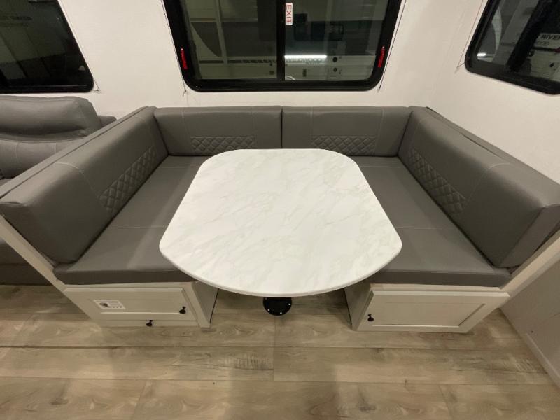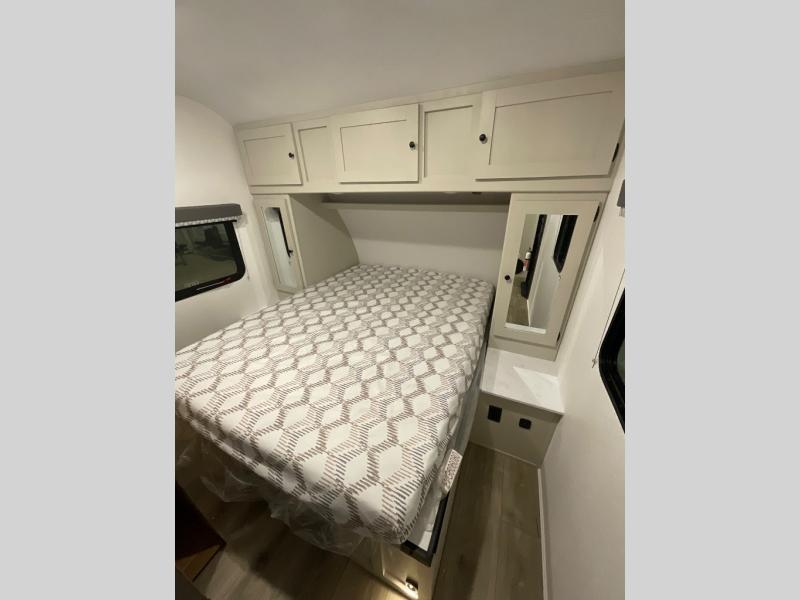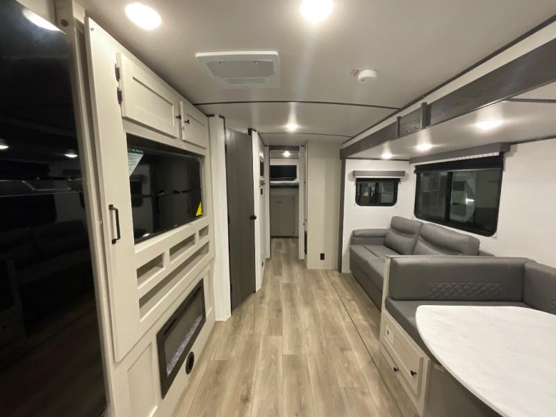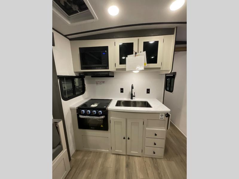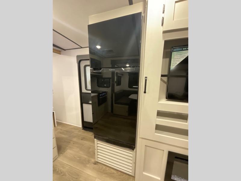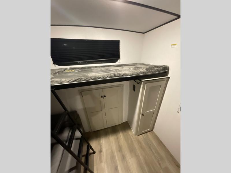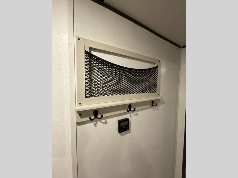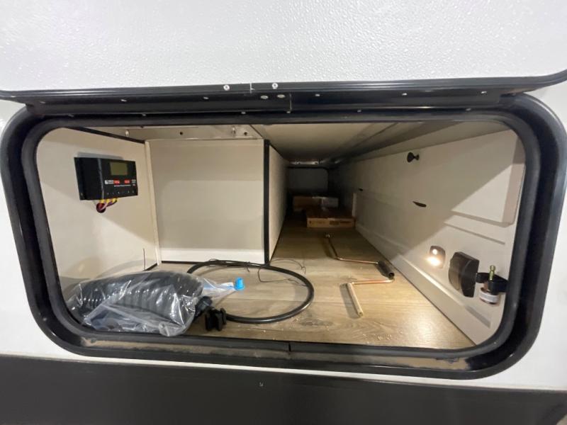 This travel trailer will be perfect to see family and friends in other states or camping for long-periods of time. There is an abundant amount of storage in the living and kitchen area, including behind the entertainment center in the hidden pantry and the second pantry with shelves, plus in the front bedroom under the queen bed with the MAX bed storage system. There is even storage in the rear private bunkhouse cabinet and countertop, plus along the exterior in the pass-through compartment and the Stor-More Cargo in the rear. The side Stor-More cargo door leads you into the bunkhouse to stow items like bikes and totes during travel. You will also love making meals in the kitchen with full amenities including a 10 cu. ft. refrigerator, and outside using the camp kitchen. And having dual entry just makes everything easy especially getting to the full bathroom.