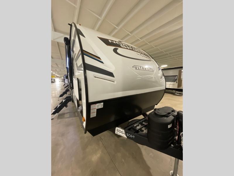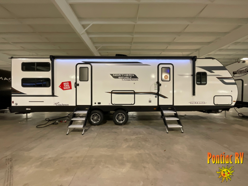 With any Northern Spirit Ultra Lite travel trailer by Coachmen, the "Twice Cool" dual ducted air conditioning system, the motion activated floor lights in the bedroom and bathroom, the lighted USB ports, the digital level, and the motion activated pass-through storage light plus fishing pole storage, will make your camping experience simplified. The heated and enclosed underbelly provides protection on the road and allows you to camp during any season, the 200W solar panel with 30 amp controller provides off-grid camping, and the power tongue jack makes setup easier. Each is built with a 3/4 painted fiberglass front cap with LED strip lights, a laminated, aluminum framed floor, rear wall, and sidewalls, plus 5" trusses with an interior vault. Make your decision today, and camp with everything in its place!