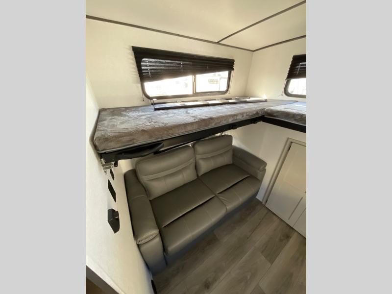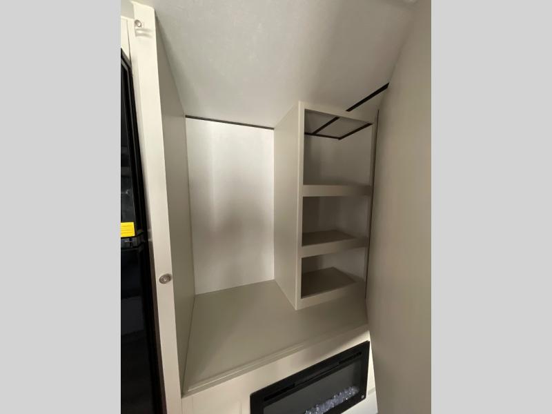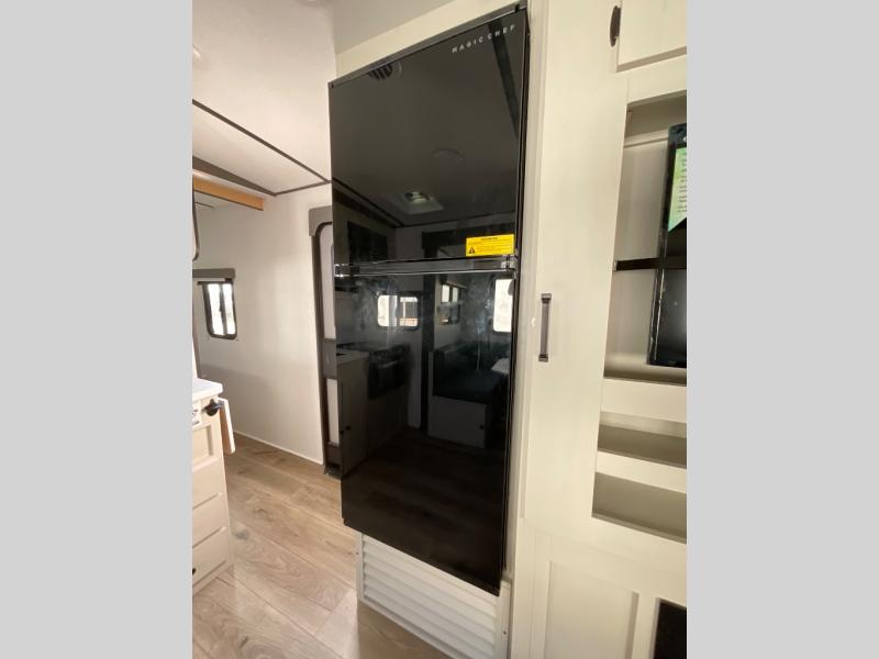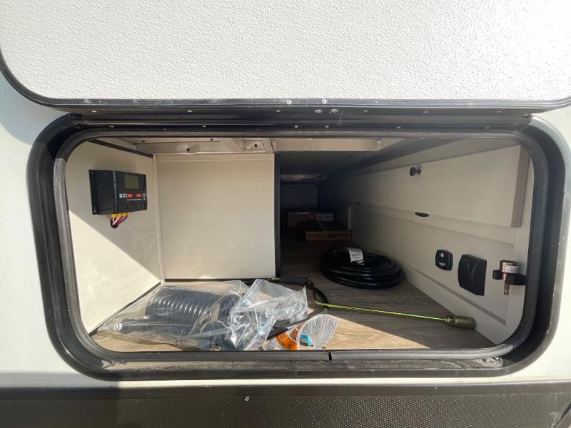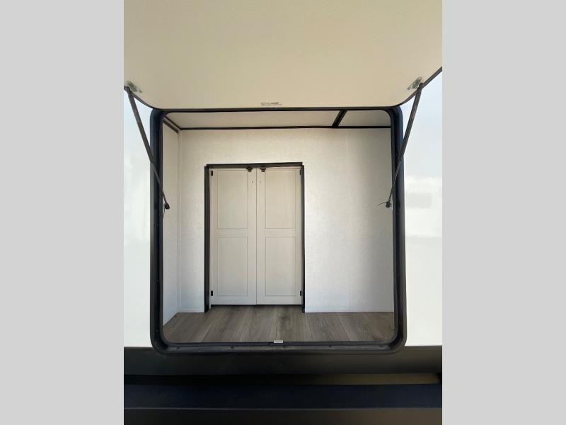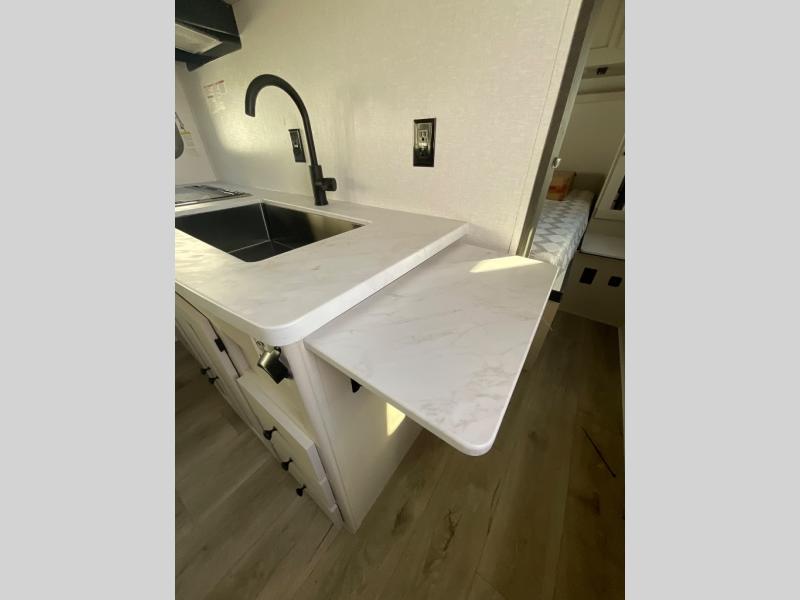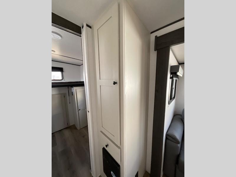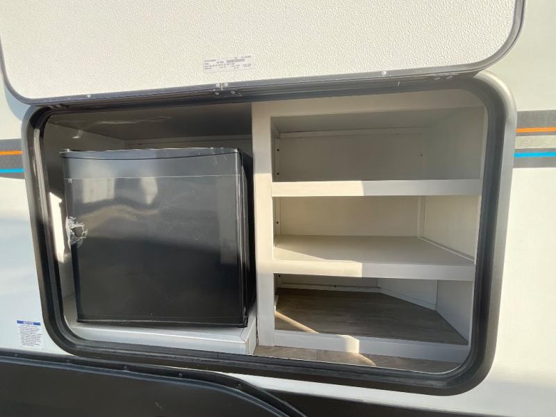 This travel trailer will be perfect to see family and friends in other states or camping for long-periods of time. There is an abundant amount of storage in the living and kitchen area, including behind the entertainment center in the hidden pantry and the second pantry with shelves, plus in the front bedroom under the queen bed with the MAX bed storage system. There is even storage in the rear private bunkhouse cabinet and countertop, plus along the exterior in the pass-through compartment and the Stor-More Cargo in the rear. The side Stor-More cargo door leads you into the bunkhouse to stow items like bikes and totes during travel. You will also love making meals in the kitchen with full amenities including a 10 cu. ft. refrigerator, and outside using the camp kitchen. And having dual entry just makes everything easy especially getting to the full bathroom.
