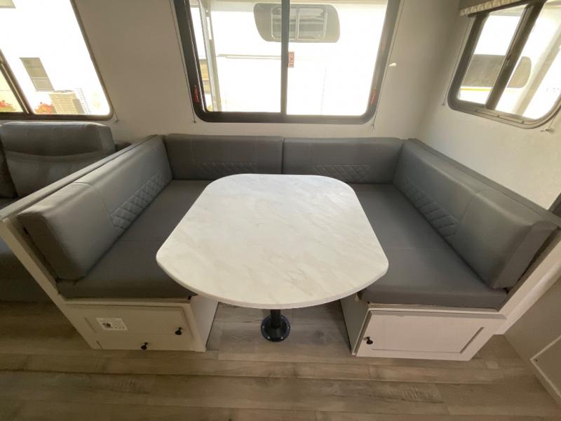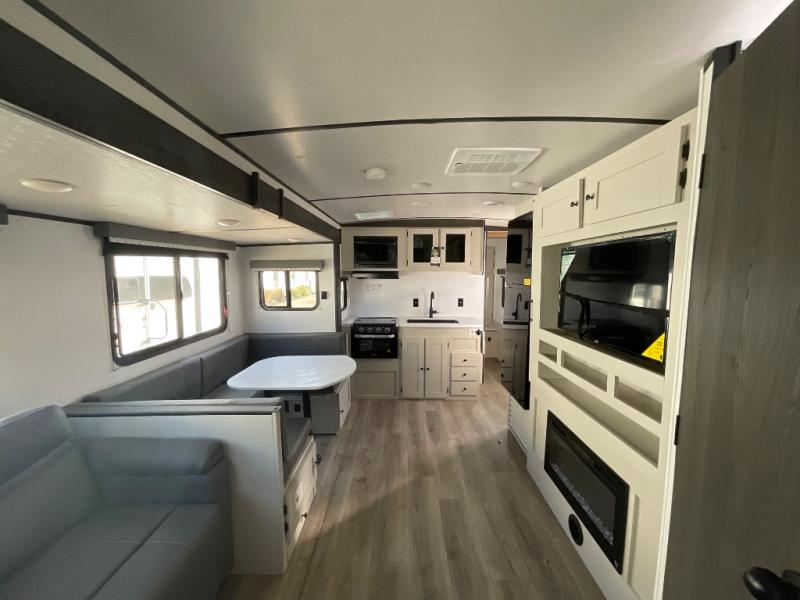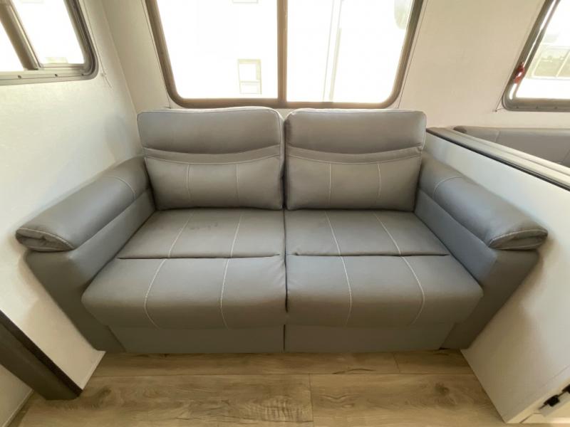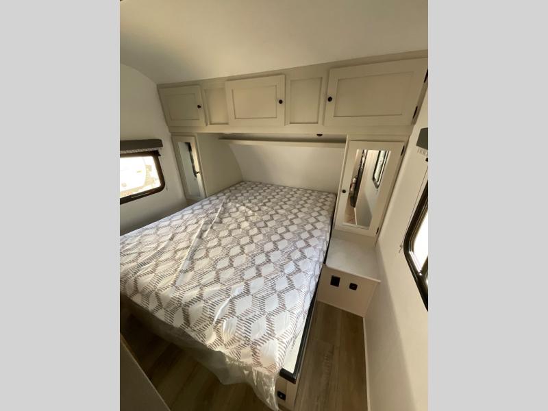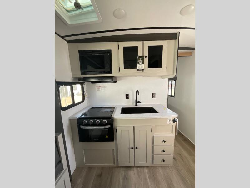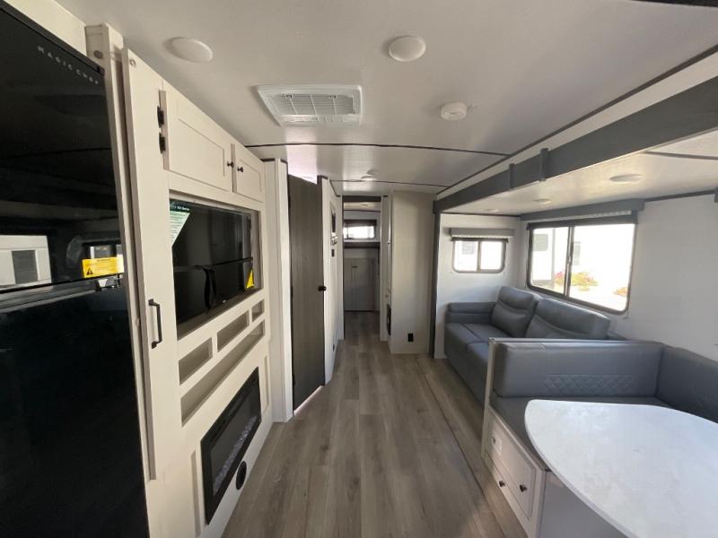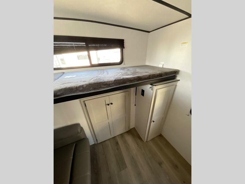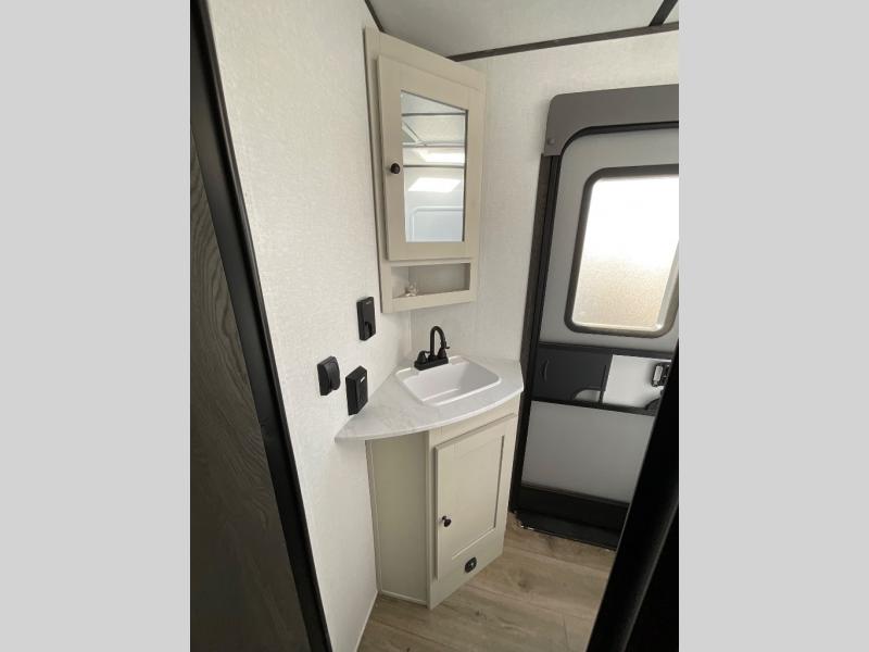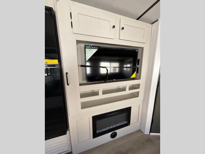 This travel trailer will be perfect to see family and friends in other states or camping for long-periods of time. There is an abundant amount of storage in the living and kitchen area, including behind the entertainment center in the hidden pantry and the second pantry with shelves, plus in the front bedroom under the queen bed with the MAX bed storage system. There is even storage in the rear private bunkhouse cabinet and countertop, plus along the exterior in the pass-through compartment and the Stor-More Cargo in the rear. The side Stor-More cargo door leads you into the bunkhouse to stow items like bikes and totes during travel. You will also love making meals in the kitchen with full amenities including a 10 cu. ft. refrigerator, and outside using the camp kitchen. And having dual entry just makes everything easy especially getting to the full bathroom.