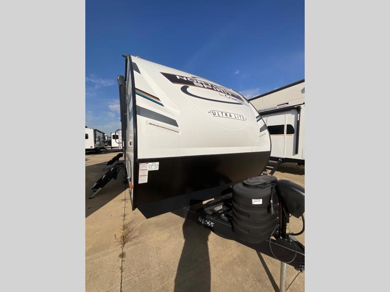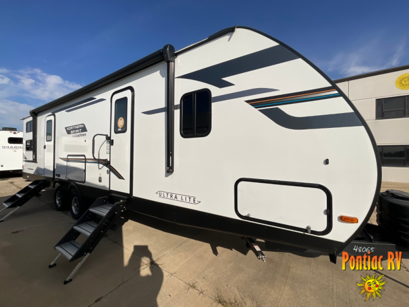 With any Northern Spirit Ultra Lite travel trailer by Coachmen, the "Twice Cool" dual ducted air conditioning system, the motion activated floor lights in the bedroom and bathroom, the lighted USB ports, the digital level, and the motion activated pass-through storage light plus fishing pole storage, will make your camping experience simplified. The heated and enclosed underbelly provides protection on the road and allows you to camp during any season, the 200W solar panel with 30 amp controller provides off-grid camping, and the power tongue jack makes setup easier. Each is built with a 3/4 painted fiberglass front cap with LED strip lights, a laminated, aluminum framed floor, rear wall, and sidewalls, plus 5" trusses with an interior vault. Make your decision today, and camp with everything in its place!