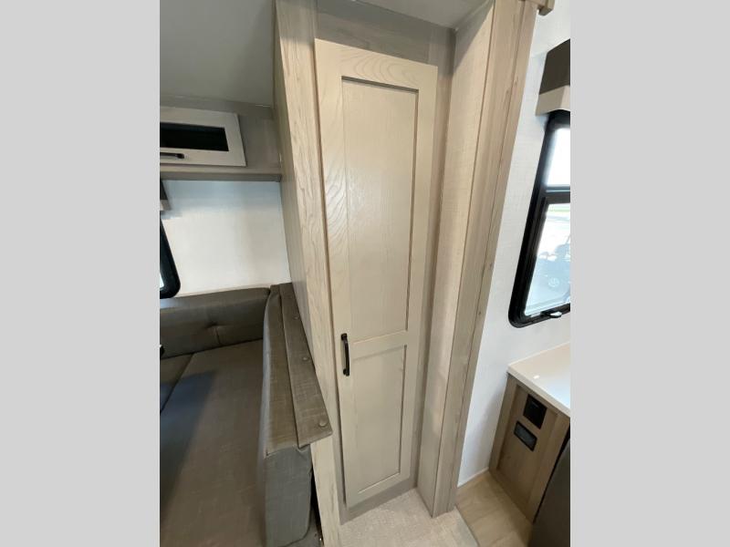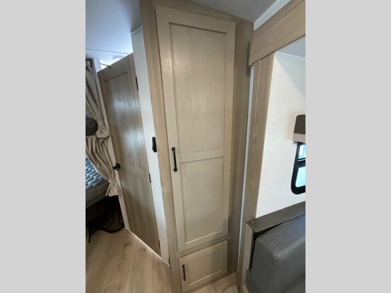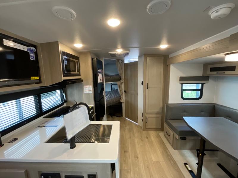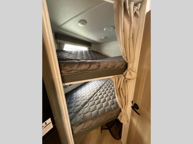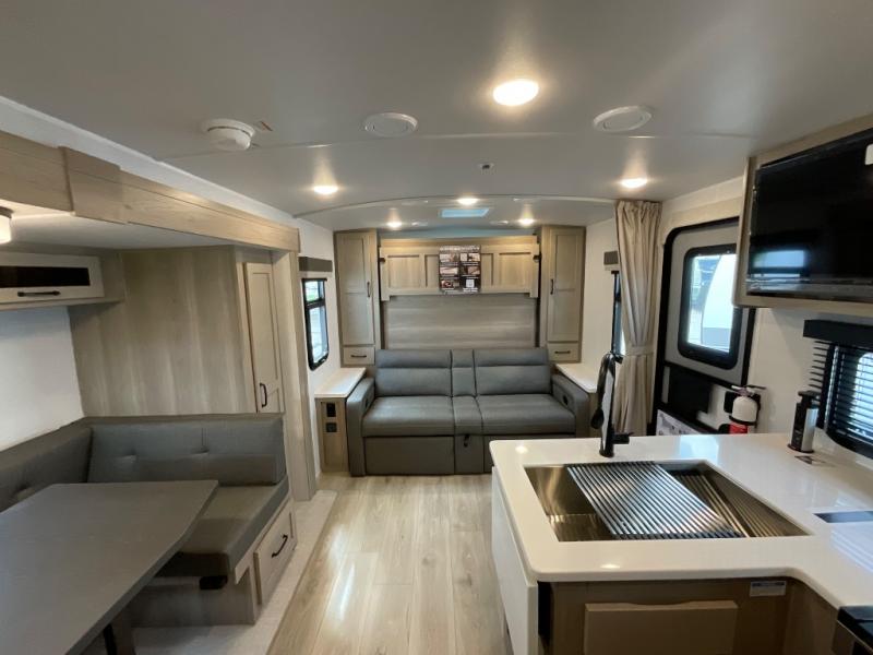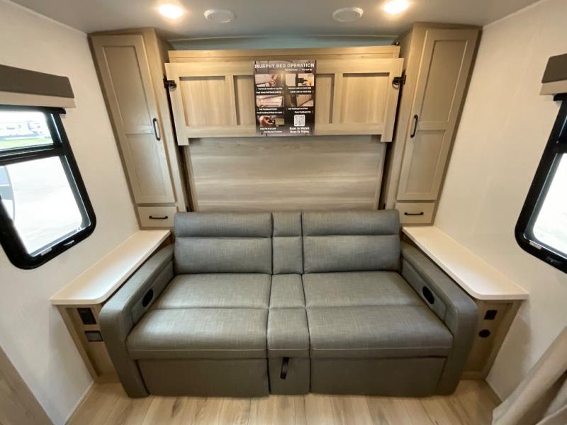 Finally, a lightweight travel trailer with double-size bunks for the kids or your guests! You'll find the versatile Murphy bed up front will be super convenient when you need more space to move around, and the 72" sofa will provide comfy seating space when the bed is put up. This model also includes a U-shaped dinette slide perfect to dine around, play games, and sleep additional guests. A 32" TV in the main living area will allow you to watch your favorite shows in the evenings, or you may just find yourselves outdoors under the 18' power awning with LED lights. And check out the pass-through storage, plus additional exterior storage for your hiking gear!