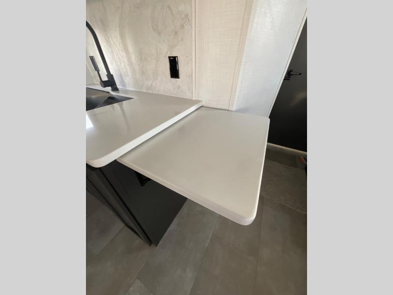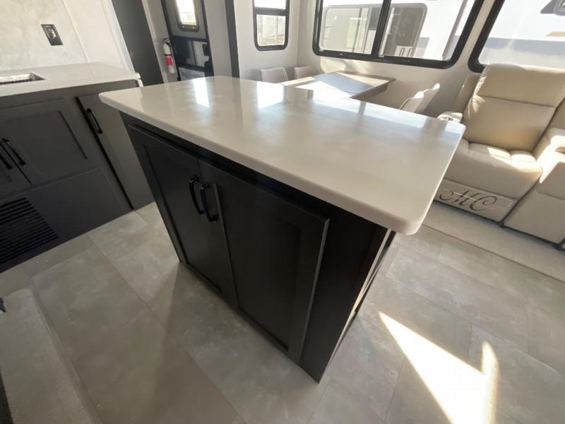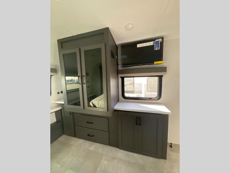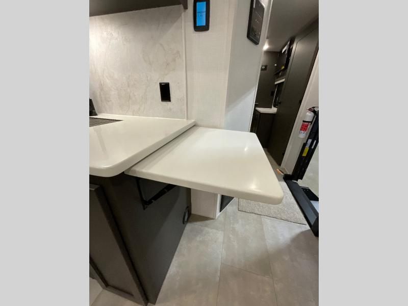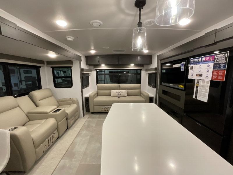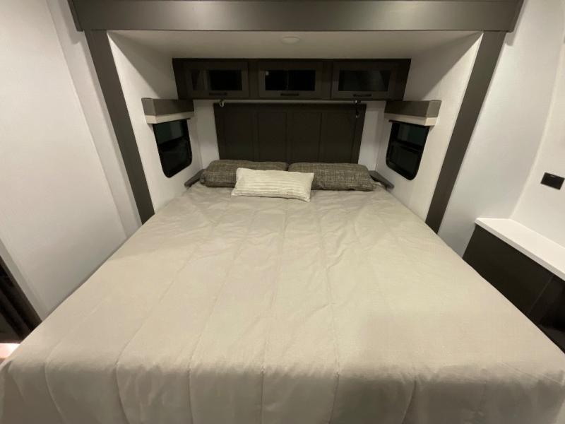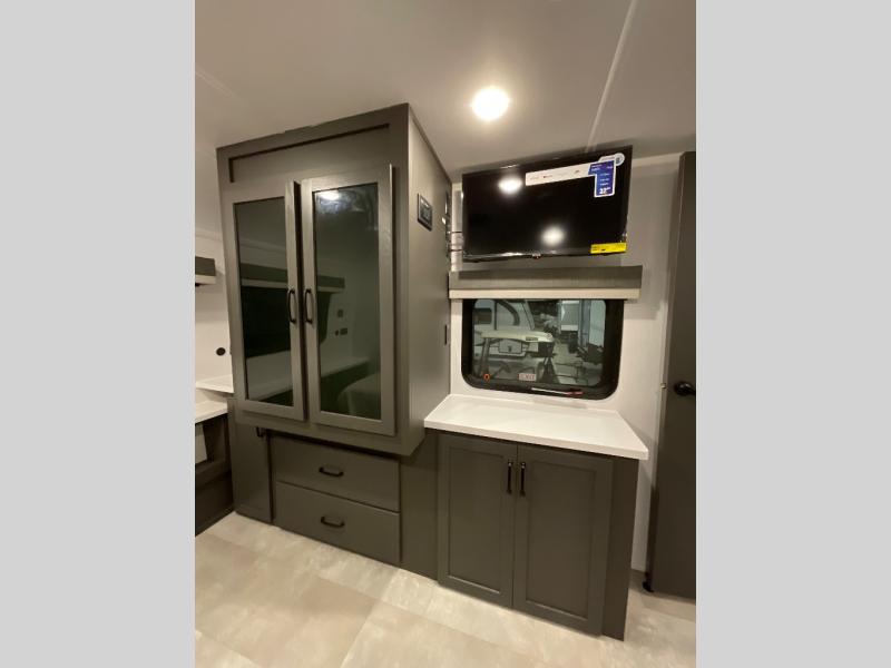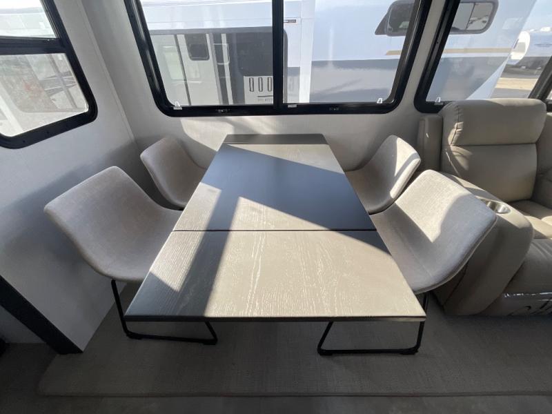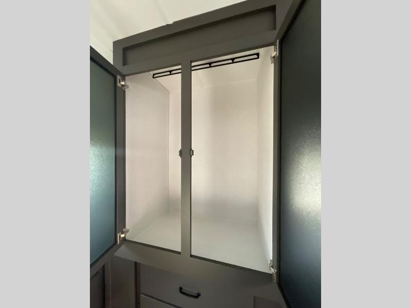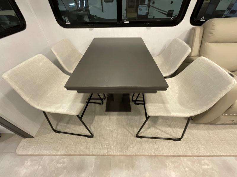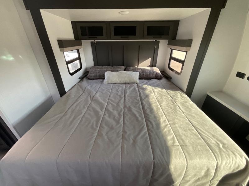 This trailer allows you to seat nine people, and the kitchen island provides a great place for the snacks and beverages. The dual opposing slides give the main living and kitchen area lots of floor space for everyone to move around, and the double entry bath is convenient with access from the hallway and the master suite. The front bedroom offers a queen bed slide, a wardrobe and storage along the front wall, plus you can choose to add an optional TV. And the two 11' power awnings give you an outdoor living area protected from the elements; just add your camping chairs.