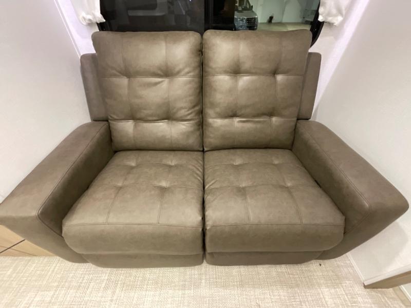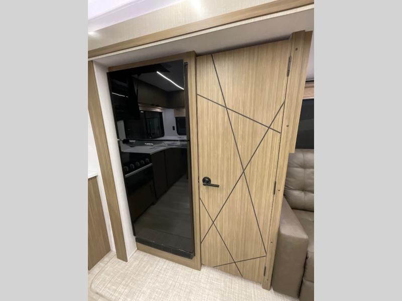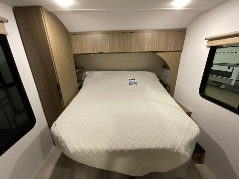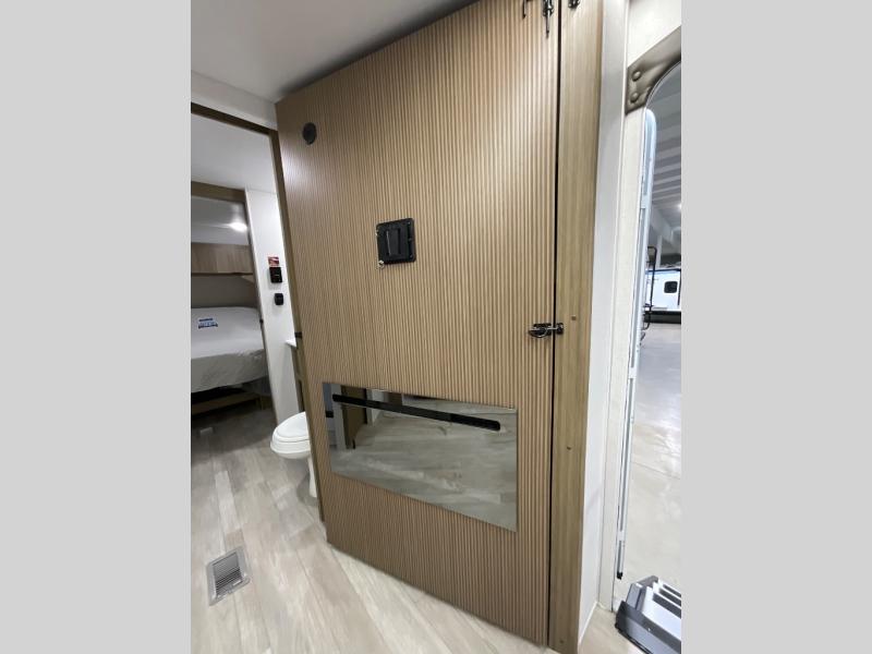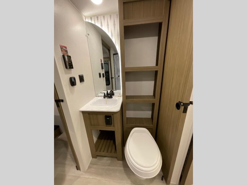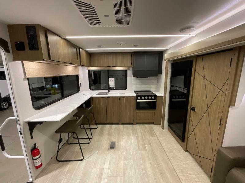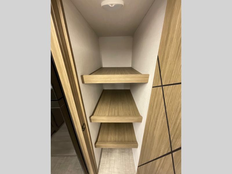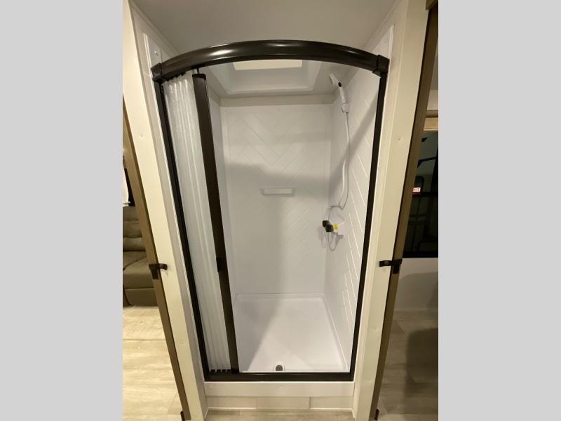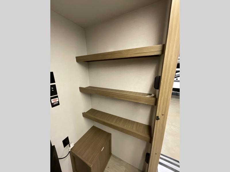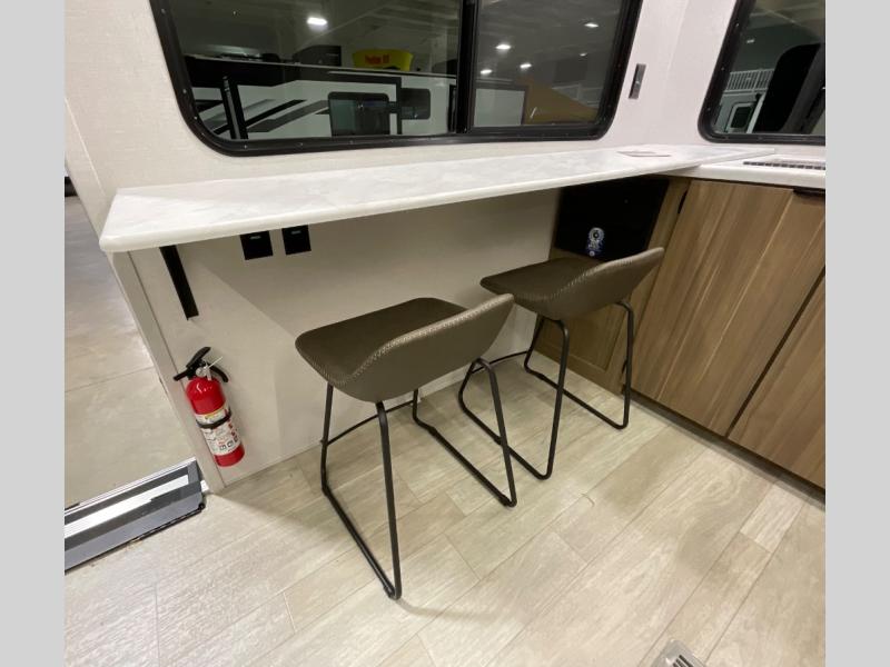 You're going to love cooking in the rear kitchen of this travel trailer! It has everything you need to prepare delicious home cooked meals including a large pantry and oversized fridge, plus there are two bar stools to sit on while you enjoy them. The theater seating is conveniently across from the swiveling entertainment center which has hidden shelves behind it for your games and movies. As you walk through the bathroom, you will notice a walk-in shower to the left and a toilet and sink to the right. It leads directly into the front private bedroom which has a Versa-Tilt custom king bed to lay your head on at night and wardrobes/nightstands on either side for your items!