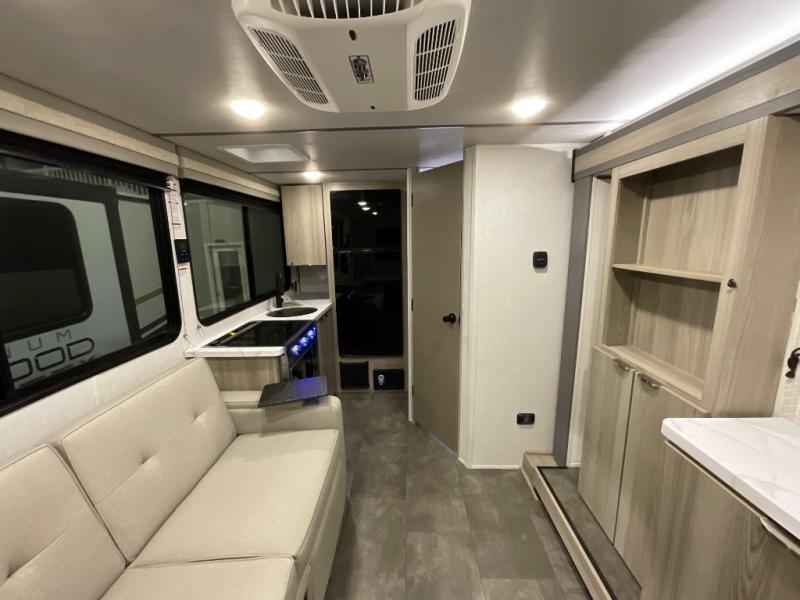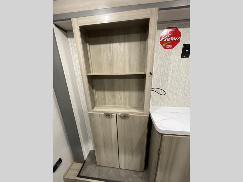 Perfect for your family, this single slide with split bunk and queen bed provides your family comfortable sleeping for four, and the slide adds a bit more interior space in camp. The split bunk is located behind the spice rack door and TV for your entertainment and cooking needs. Speaking of cooking, you can prepare your best home cooked meals with the cooktop, and store any leftovers in the dual swinging 12V refrigerator. Relax each night in the theater seating and freshen up in the rear corner bathroom each morning which features a skylight over the shower for more natural lighting.