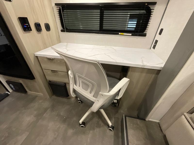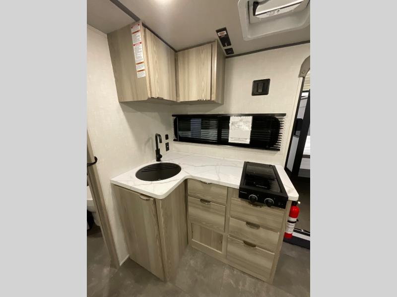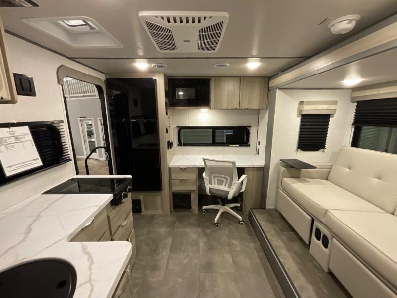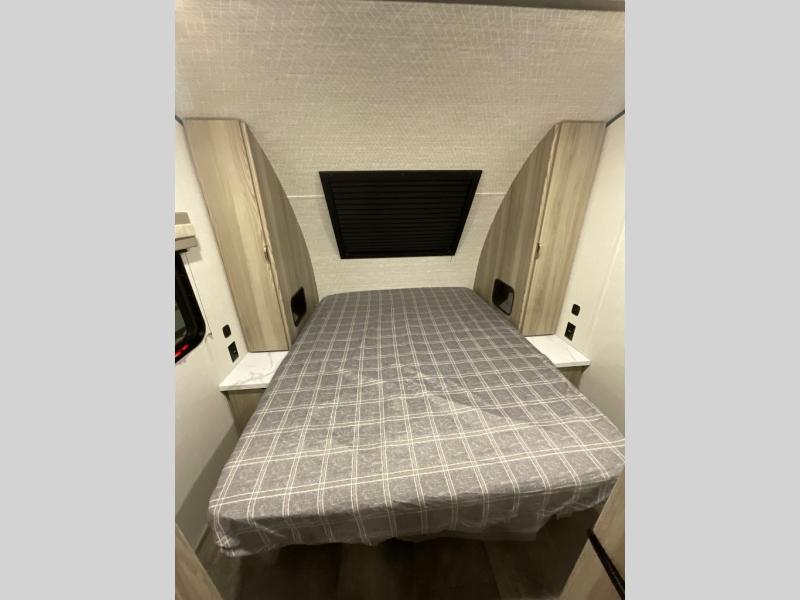 You're going to love every minute spent in this couple's trailer. The queen bed in the front private bedroom will provide a great night's rest, and there are dual wardrobes to easily get dressed in the morning. Head to the kitchen through the bath, then prepare eggs and bacon on the two burner cooktop. There is theater seating here to enjoy your coffee at each morning, or you may want to get some work done at the mobile station!