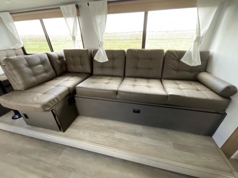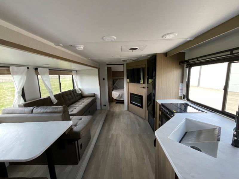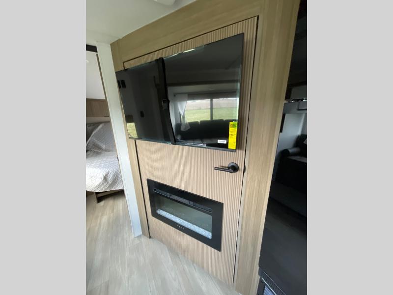 You're sure to make camping memories in this spacious travel trailer! You can easily sleep eight people each night thanks to the double-size bunks, the custom king bed with Versa Tilt in the front bedroom plus the Versa-Lounge within the large slide out! The full kitchen will let you make meals each day, and you'll appreciate the hidden pantry with shelves behind the fireplace. There is also a booth dinette where you can dine together or play a game of cards after dinner is cleaned up, or you may just find yourselves outdoors under the 16' awning. And don't overlook the full bath, complete with a tub/shower that will make bath time easier if you have little ones.