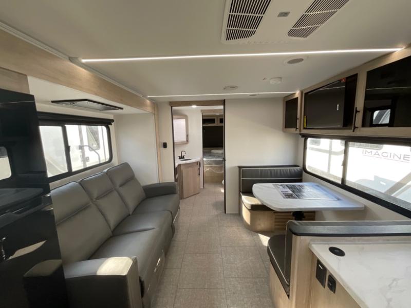 Treat yourself to a weekend of fun in this Imagine XLS travel trailer! Whether it's just you and your spouse, or you've chosen to bring along a group of friends, this trailer will meet the need. The front bedroom can sleep two people on the walk-around queen-size bed. The bedroom is quite functional because it not only contains the second exterior entry door, but it also has a private entrance into the walk-through bathroom since it is located on the other side of the bathroom. The booth dinette is functional too because it can transform from a dining location into a sleeping location, and the theater seating is directly across from the LED TV for easy viewing.