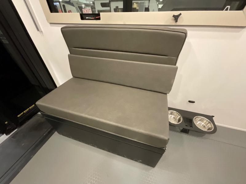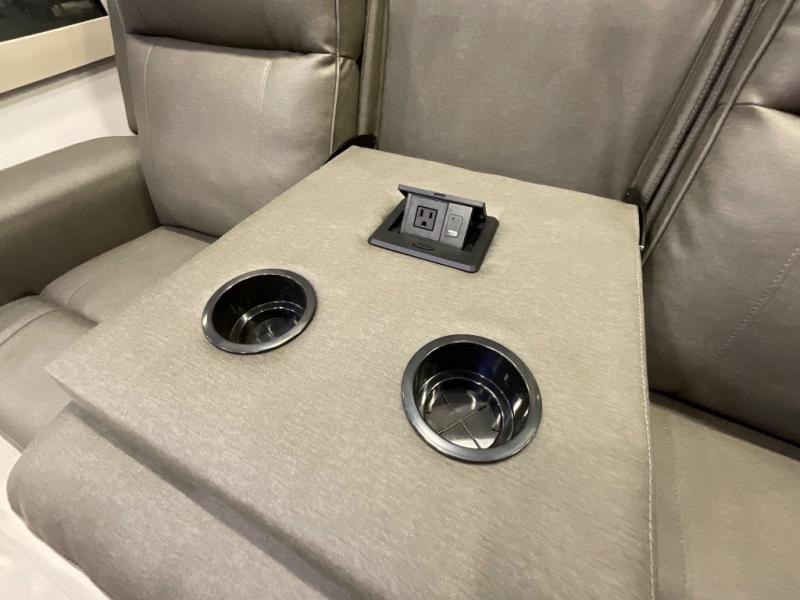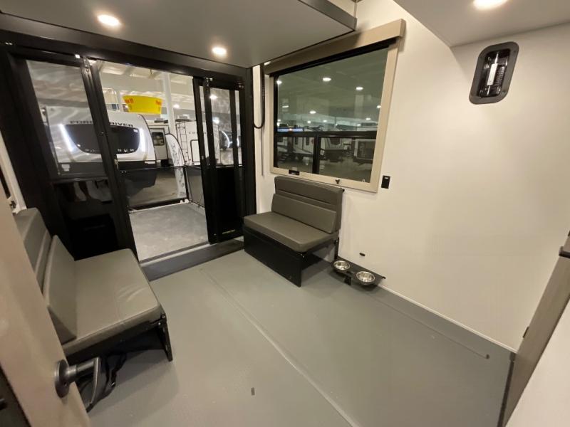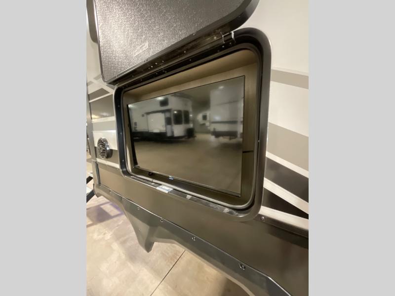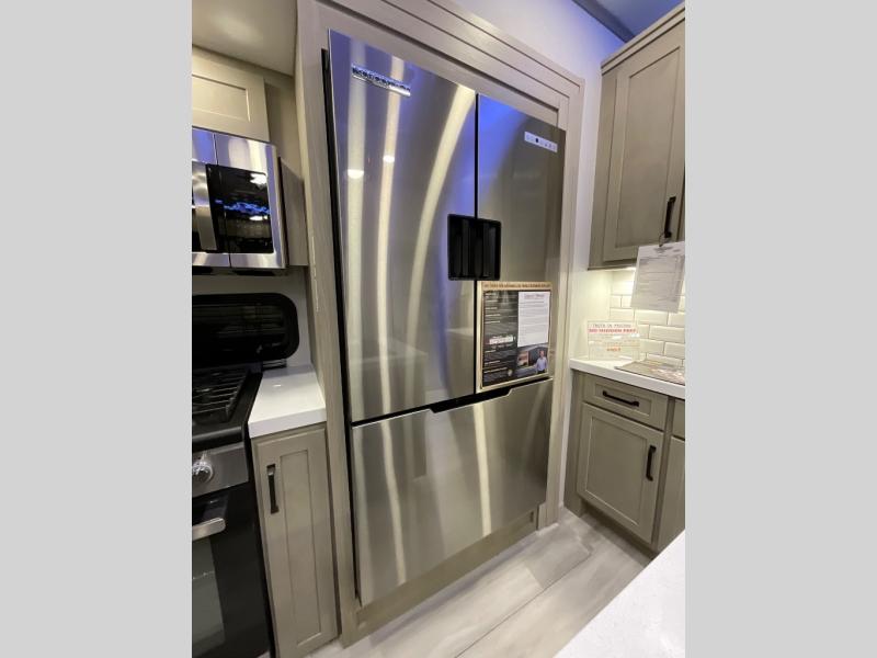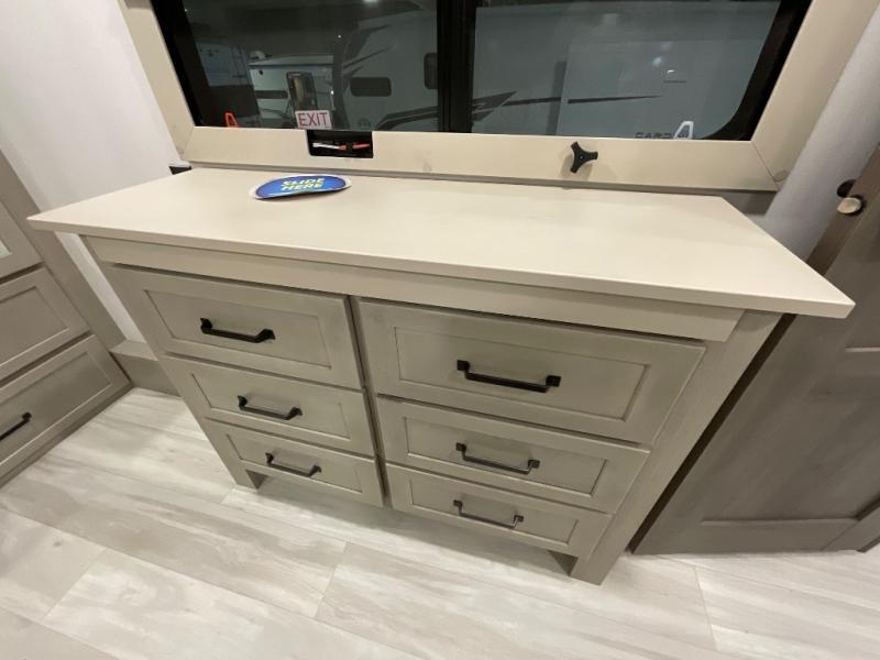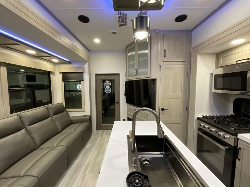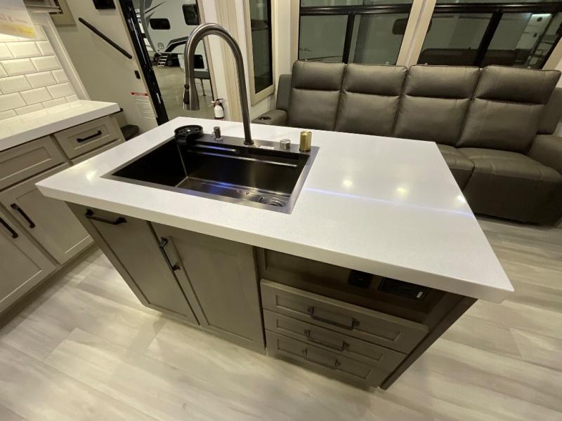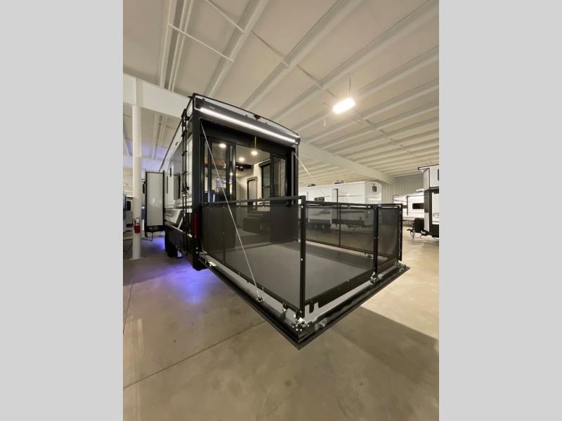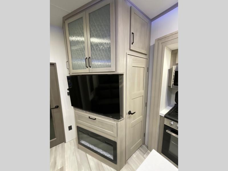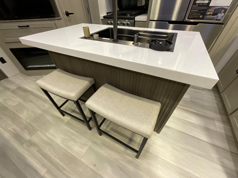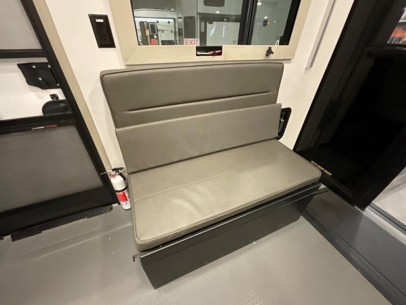 Traveling with friends and family can be comfortable when you have a full double entry bathroom and a half bath available when camping and enjoying the trails on your off-road toys! You will have an 11' garage space that can become a second living/dining area, and you can add the optional Liftsuite System for more sleeping space. An overhead bed comes standard, along with a super sofa in the main living area where guests can sleep. Everyone can watch the LED TV when waiting for dinner, and enjoy the fireplace on those chiller nights. The kitchen island offers a sink to wash dishes, extra counter space for serving meals and two stools to dine at. The cook will love all the upgraded appliances, and the space thanks to the slide. The front bedroom gives you a queen bed slide with a king bed option, lots of clothing space, and a slide top dresser for even more storage.