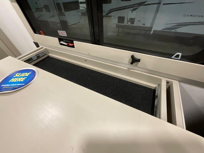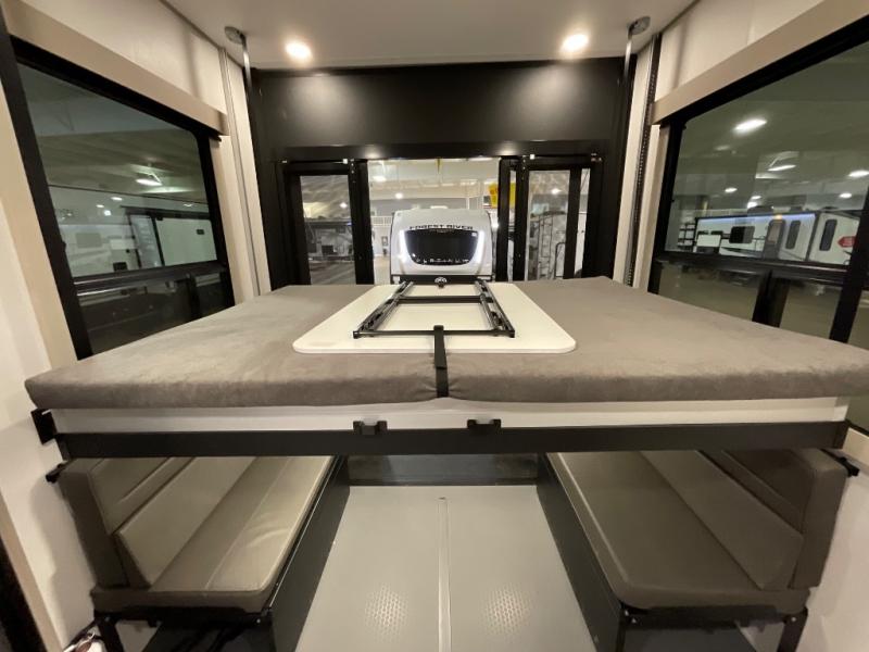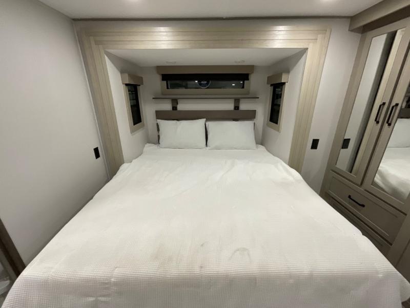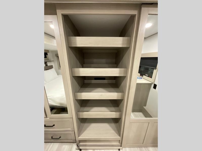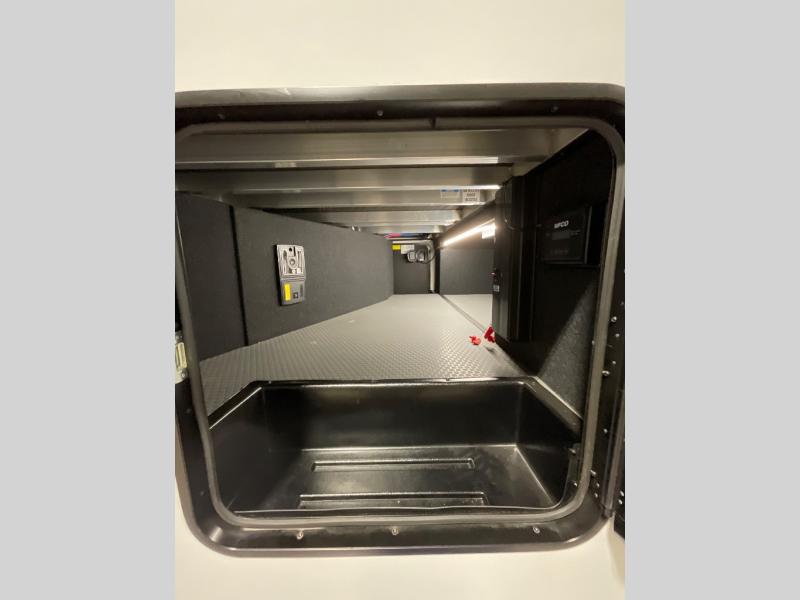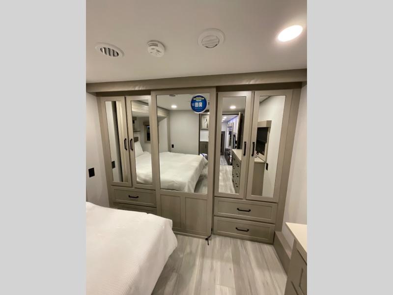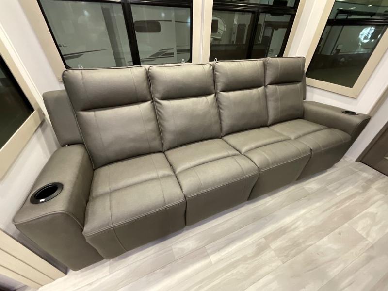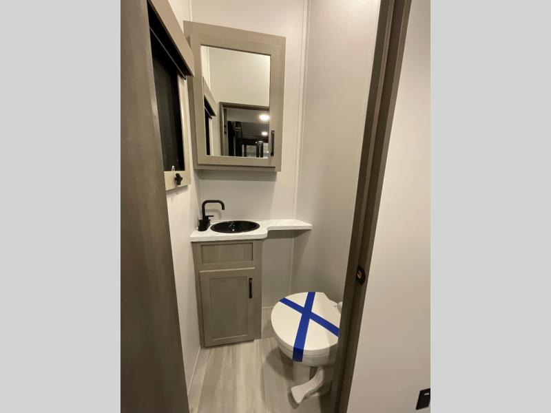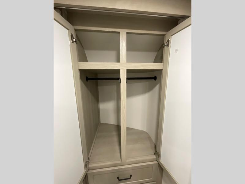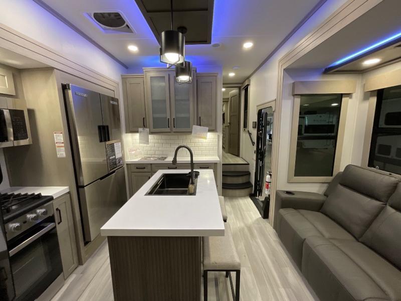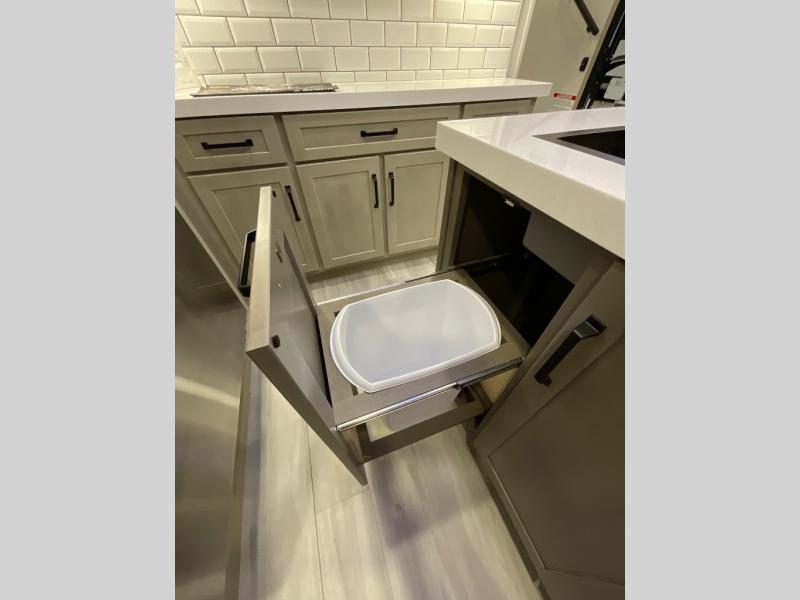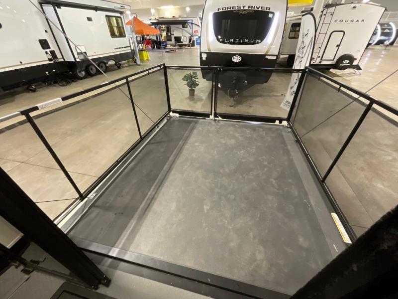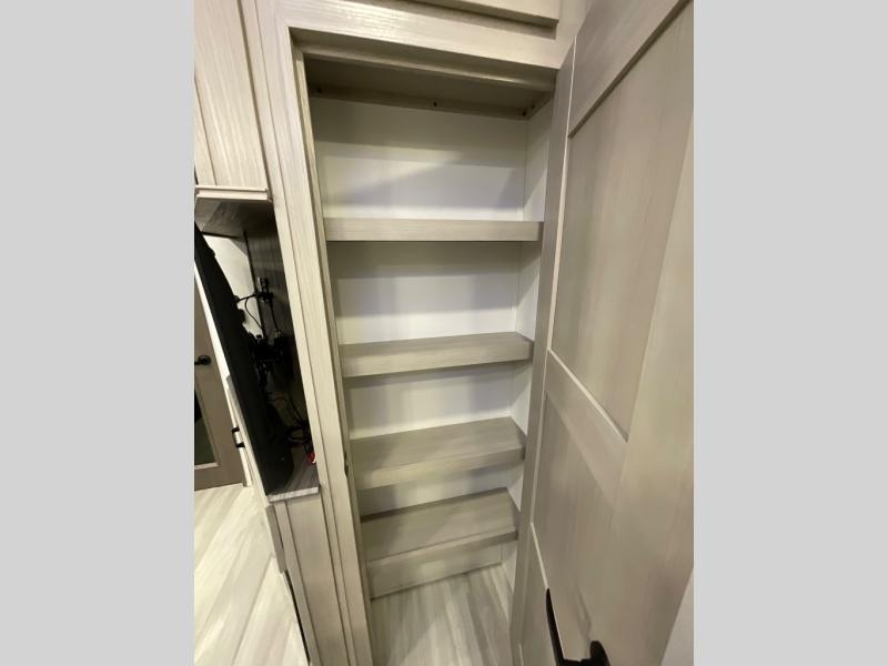 Traveling with friends and family can be comfortable when you have a full double entry bathroom and a half bath available when camping and enjoying the trails on your off-road toys! You will have an 11' garage space that can become a second living/dining area, and you can add the optional Liftsuite System for more sleeping space. An overhead bed comes standard, along with a super sofa in the main living area where guests can sleep. Everyone can watch the LED TV when waiting for dinner, and enjoy the fireplace on those chiller nights. The kitchen island offers a sink to wash dishes, extra counter space for serving meals and two stools to dine at. The cook will love all the upgraded appliances, and the space thanks to the slide. The front bedroom gives you a queen bed slide with a king bed option, lots of clothing space, and a slide top dresser for even more storage.