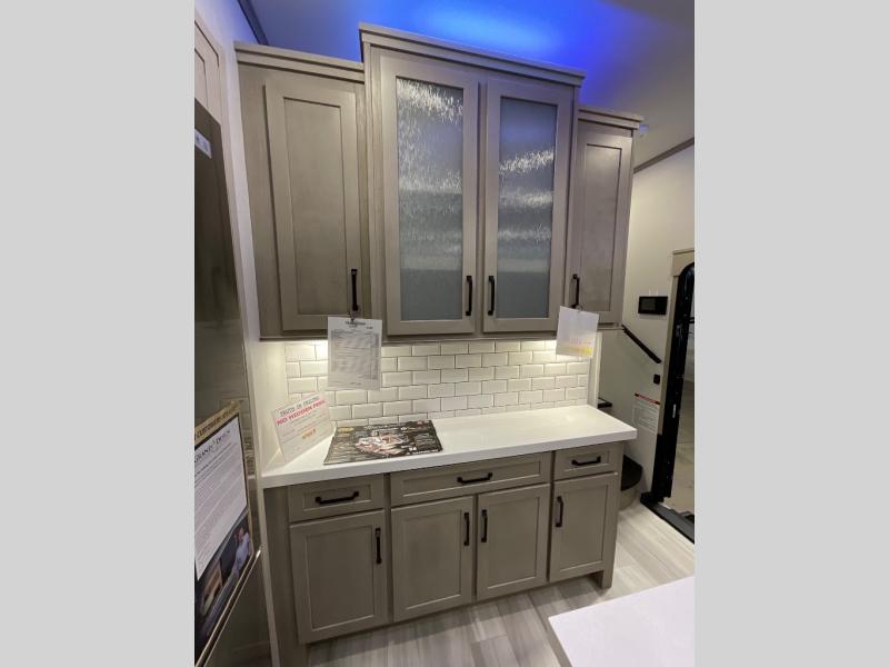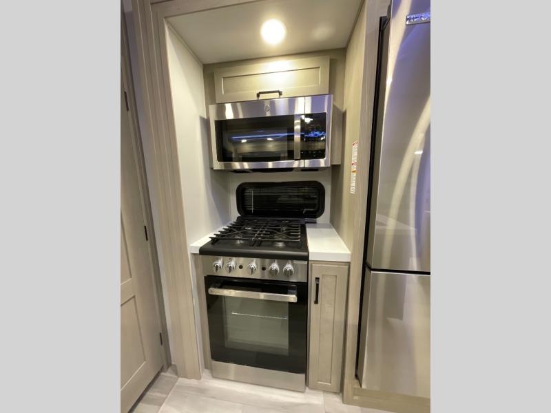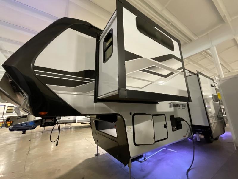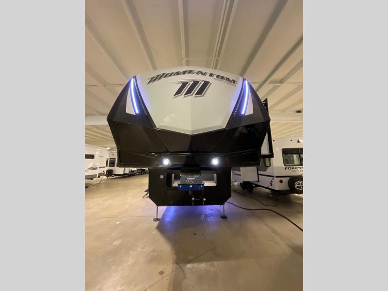 With any Momentum M-Class toy hauler by Grand Design, you will enjoy luxury at every turn! They have been constructed to a superior standard with a thermal roof design, triple insulated main floor and garage floor, and a Rail-Tite underbelly seal that will allow you to camp in all elements. Each model also features an 8' 5" wide body chassis with a wide rail design, no wheel wheels, and a dovetail entry for easier loading. The Stealth A/C system provides maximum cooling power, and the CRE3000 suspension system means you can enjoy a smooth tow each time. You will love the luxurious interior with a professional grade stainless steel cooktop, interior color changing LED accent lighting, a fiberglass shower with a glass door, and solid surface countertops.