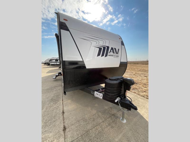 The Momentum MAV toy hauler travel trailers by Grand Design are designed to provide exactly what you need. The spacious garage provides tons of cargo space, with no wheel wells to get in the way. Additional storage includes magnetic storage door catches, underbed storage with a gas strut lift, and overhead consoles throughout. Conveniences like motion sensor lights and USB outlets will make your life easier, and you will be comfortable in all seasons with the 30K BTU furnace plus 15K BTU ducted air conditioning. The standard Solar Package comes with a 180W solar panel, a 40 Amp charge controller with Bluetooth, and a 12V refrigerator so you can go off-grid when the adventure calls for it.