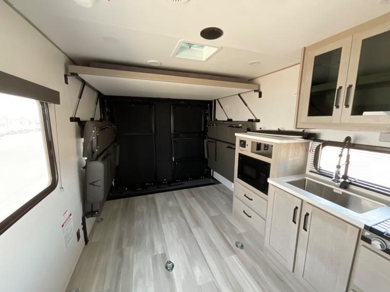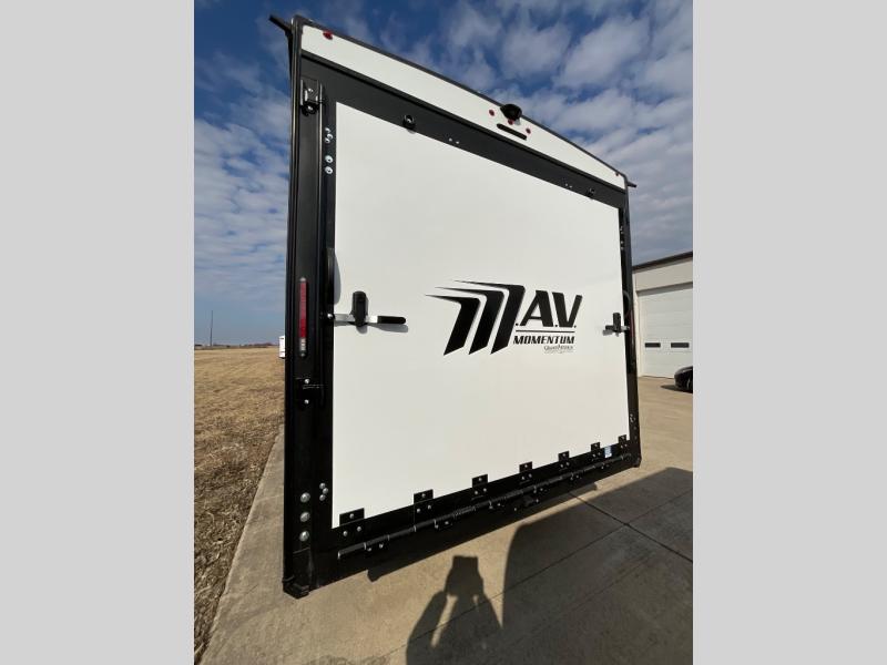 You will love this Momentum MAV toy hauler travel trailer! The front bedroom features a queen bed, and there is plenty of room to walk around. The sliding solid bedroom door helps with space. Overhead storage and a pair of nightstands are convenient storage, plus there is a wardrobe with both drawers and space to hang items. The kitchen offers a microwave, stainless steel sink, and an 8 cu. ft. 12V refrigerator. In the garage, you'll find rollover sofas with a table and a top bed for guests to sleep on. The ramp door/patio will provide additional living space once your toys are unloaded, and the pull down screen will keep bugs out!