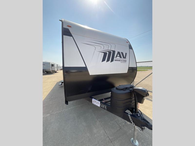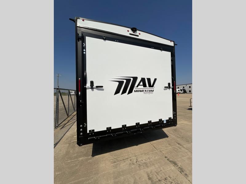 The Momentum MAV toy hauler travel trailers by Grand Design are designed to provide exactly what you need. The spacious garage provides tons of cargo space, with no wheel wells to get in the way. Additional storage includes magnetic storage door catches, underbed storage with a gas strut lift, and overhead consoles throughout. Conveniences like motion sensor lights and USB outlets will make your life easier, and you will be comfortable in all seasons with the 30K BTU furnace plus 15K BTU ducted air conditioning. The standard Solar Package comes with a 180W solar panel, a 40 Amp charge controller with Bluetooth, and a 12V refrigerator so you can go off-grid when the adventure calls for it.