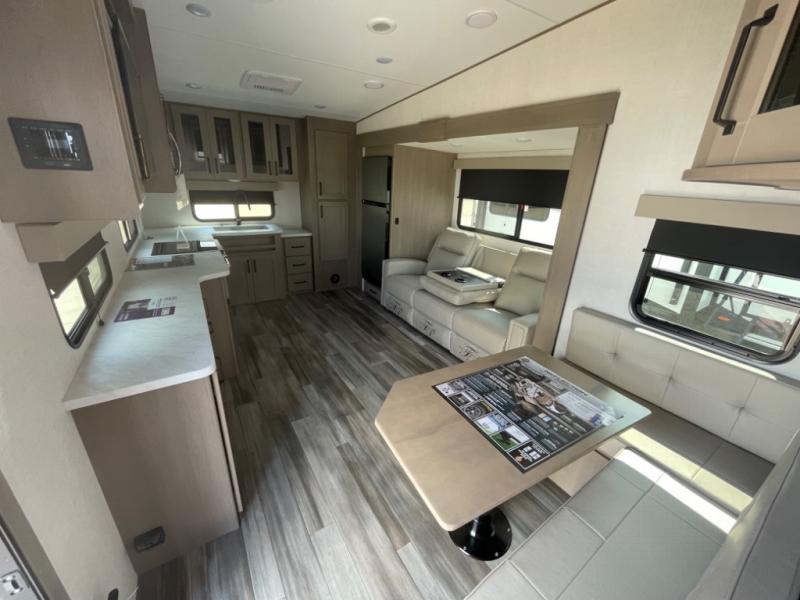 You will love this fifth wheel featuring a single slide for added interior living space and all the comforts and conveniences it provides you while you travel. The slide features a 78" theater seat plus there is a breakfast nook for more seating. Both can easily view the entertainment center with 40" TV. A rear kitchen indoors provides everything you need to create meals like home while on the road, and if you want to spend as much time outside as possible, then the outdoor griddle will certainly accommodate you for meals. Up front, a cozy private bedroom with queen bed, wardrobe, and overhead cabinets. Right next door, you will find a large walk-in shower, as well as a toilet, and a vanity with sink and linen cabinet for your towels and toiletries. You will also love the full unobstructed pass-through compartment for all of your gear, plus so much more!