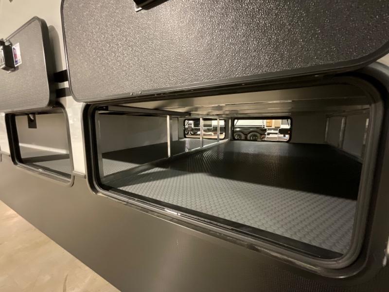 A full rear bathroom creates a master suite in this fifth wheel! The private bedroom has a king bed slide with storage underneath for extra blankets, a chest with a TV, and access to the full bathroom which has a dual sink vanity, a shower with a seat, and a closet with stackable washer and dryer prep. The half bathroom is by the kitchen so you can quickly get back to preparing your delicious meal with the three burner cooktop and kitchen island then enjoy your meals at the free standing dinette. The front living area has a front entertainment center with a 40" fireplace and 50" TV with overhead cabinets to store your movies, as well as opposing tri-fold sofa sleeper slides and Thomas Payne theater seating with heat, massage, LED lights, and a USB charging station.