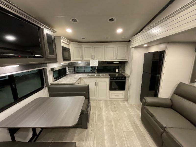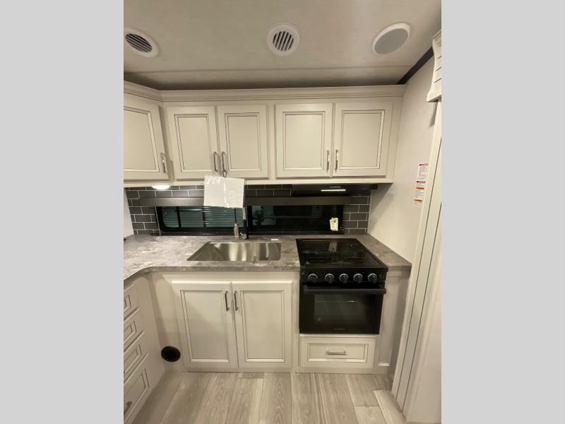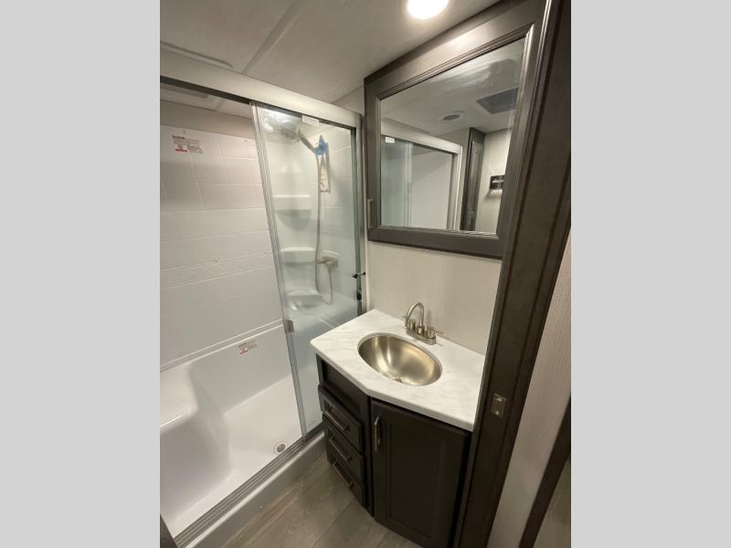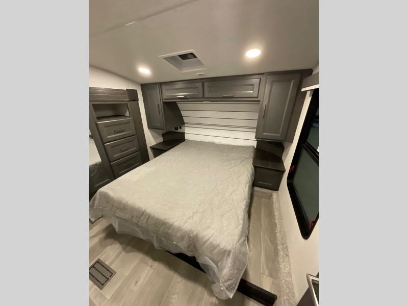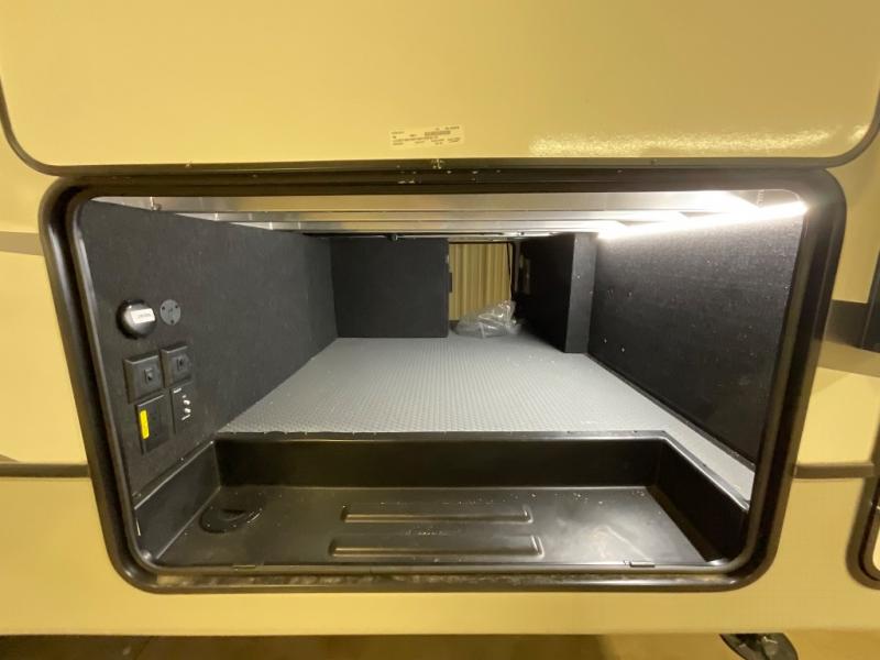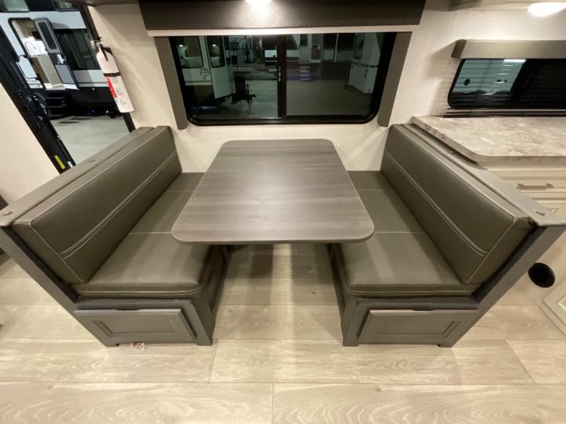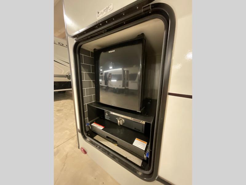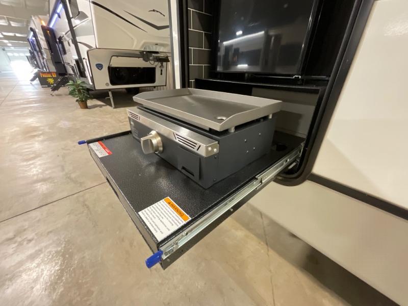 If you are looking for a fifth wheel that sleeps four to six with inside and outside cooking then check this unit out! This unit offers a short, mid-living layout with a bedroom wardrobe slide and combined 12 volt refrigerator and 68" tri-fold sofa sleeper slide for added floorspace to move about. Up front, you will enjoy a private bedroom with a queen bed and bedside wardrobe/nightstands as well as a larger wardrobe that slides out along the curbside wall. A complete bath provides a large shower, toilet and sink, plus linen storage which you are sure to appreciate as you travel. There are plenty of options for this unit making it easy to customize to your use and style. The theater seating and free standing dinette options can be selected in place of the sleeper sofa and booth dinette if you prefer. If you enjoy spending time outdoors, imagine making breakfast for your friends and family using the outside griddle. There is also a 16' awning to create even more living space to enjoy, and the unobstructed pass-through storage compartment can easily house all of your outdoor camping gear like lawn chairs and yard games.