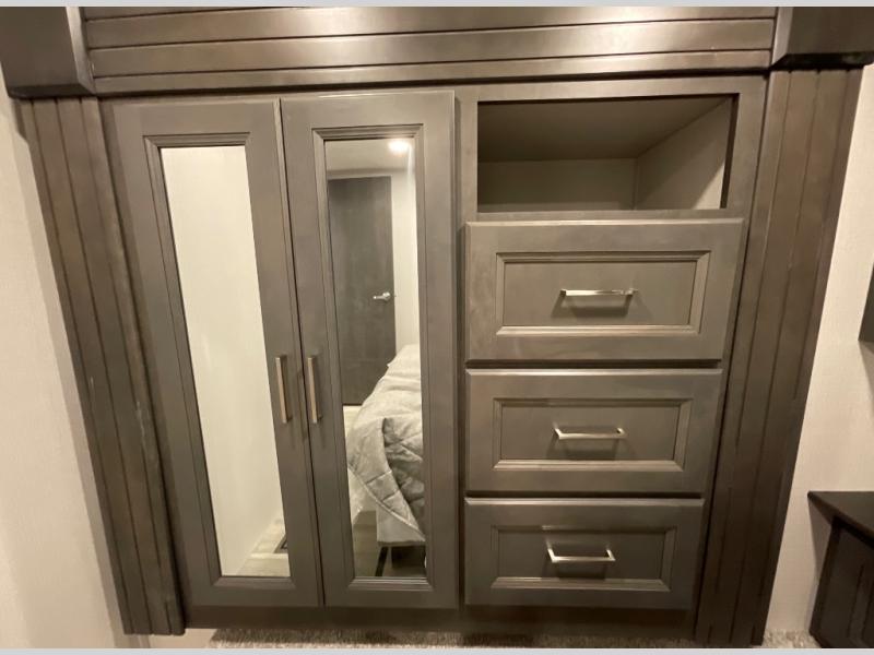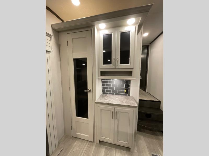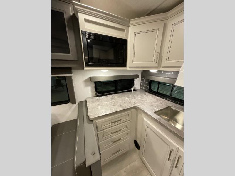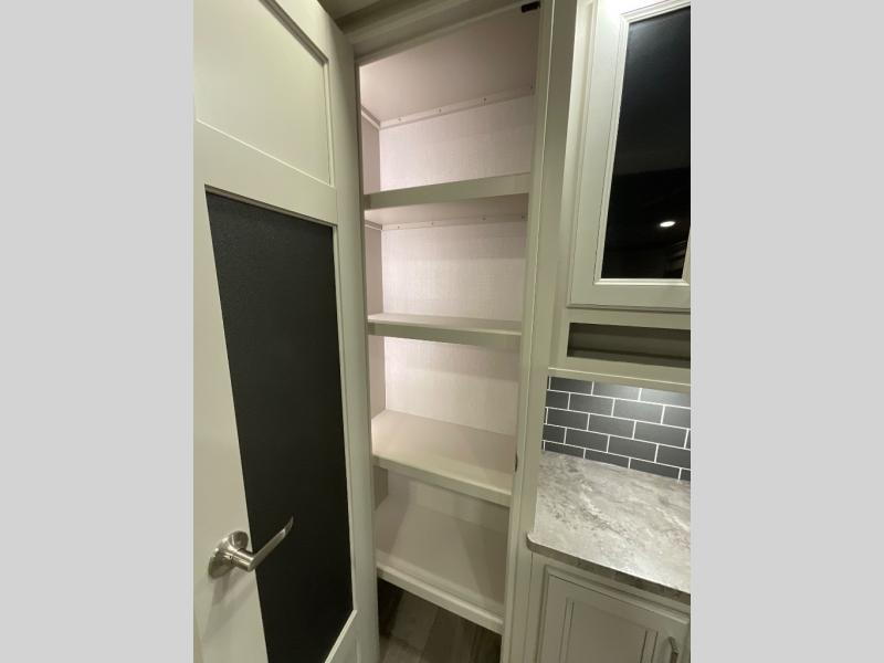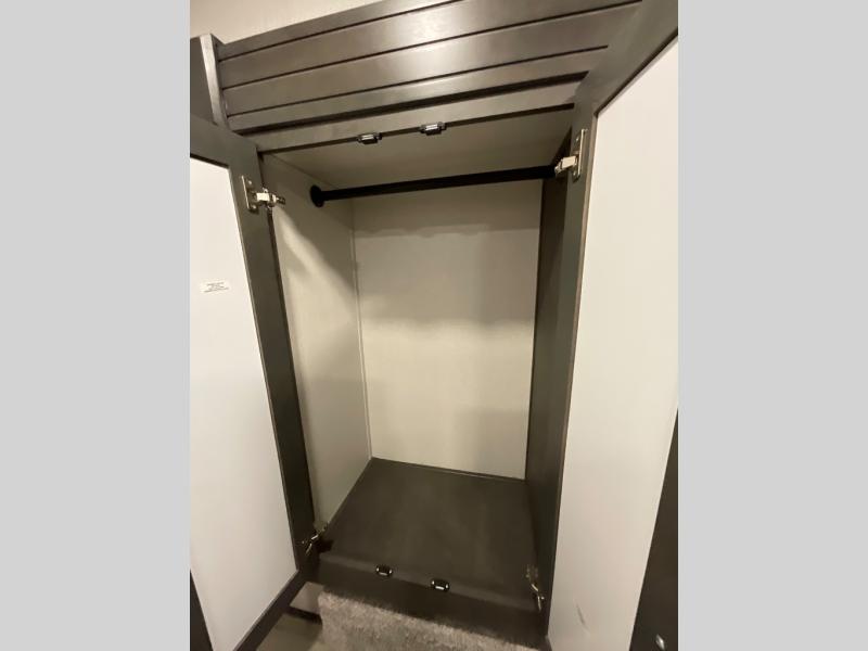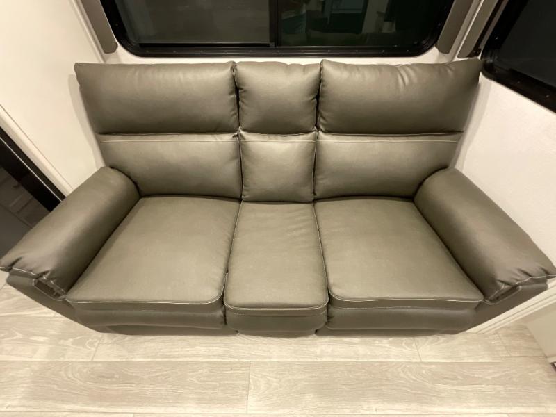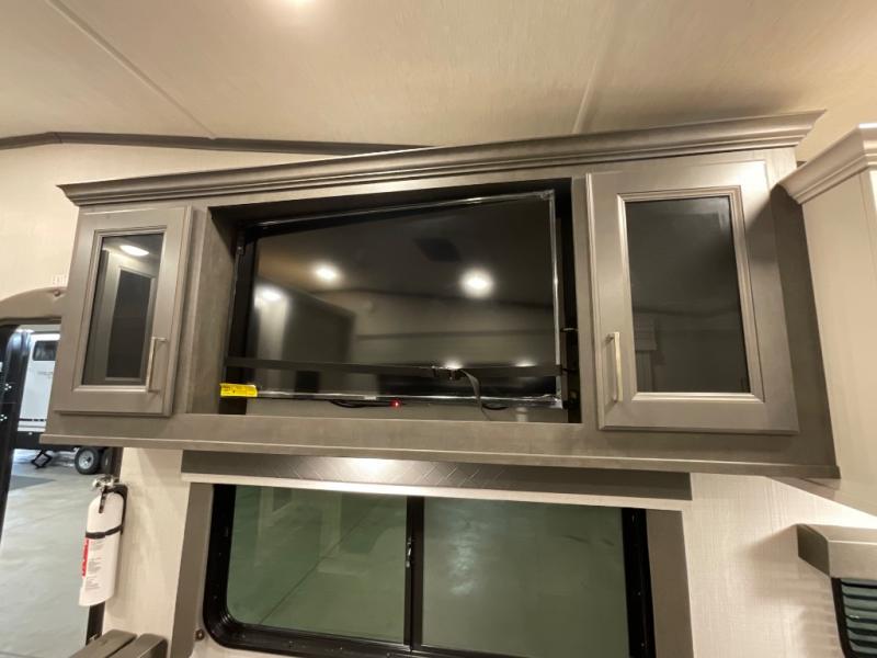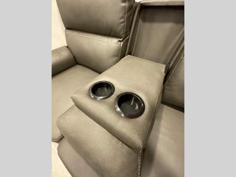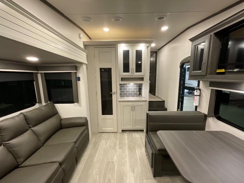 If you are looking for a fifth wheel that sleeps four to six with inside and outside cooking then check this unit out! This unit offers a short, mid-living layout with a bedroom wardrobe slide and combined 12 volt refrigerator and 68" tri-fold sofa sleeper slide for added floorspace to move about. Up front, you will enjoy a private bedroom with a queen bed and bedside wardrobe/nightstands as well as a larger wardrobe that slides out along the curbside wall. A complete bath provides a large shower, toilet and sink, plus linen storage which you are sure to appreciate as you travel. There are plenty of options for this unit making it easy to customize to your use and style. The theater seating and free standing dinette options can be selected in place of the sleeper sofa and booth dinette if you prefer. If you enjoy spending time outdoors, imagine making breakfast for your friends and family using the outside griddle. There is also a 16' awning to create even more living space to enjoy, and the unobstructed pass-through storage compartment can easily house all of your outdoor camping gear like lawn chairs and yard games.