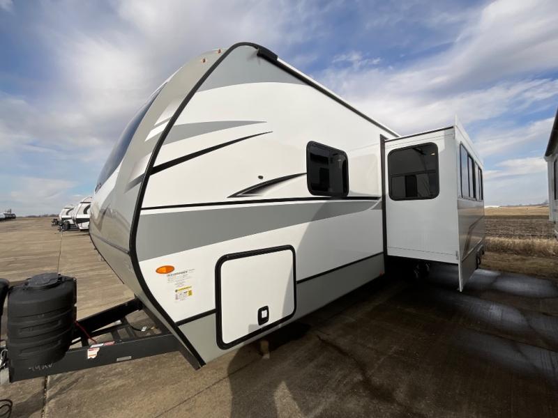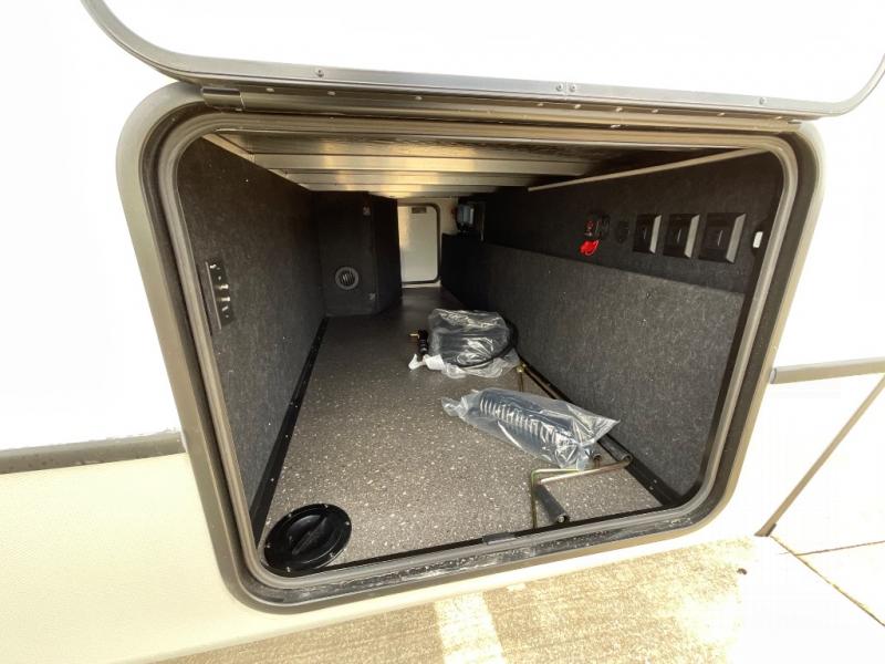 With dual entry doors in this travel trailer, you can enter in through the main living area or the full bath for convenience! Once inside, the sleeper sofa and booth dinette provide places to relax, eat, and play games, plus there is an entertainment center with hidden storage behind to keep movies organized. A full kitchen with a three burner cooktop and 12V refrigerator will allow you to cook and store food, or you can head outdoors to cook on the outdoor kitchen. There is also drop-frame storage outside for fishing poles and hiking gear, and the 21' electric awning provides shade as you relax. When it's time to call it a night, the king bed in the front private bedroom is sure to bring comfort, while the little ones take the double-size bunks, and any other guests can sleep on the living room furniture!