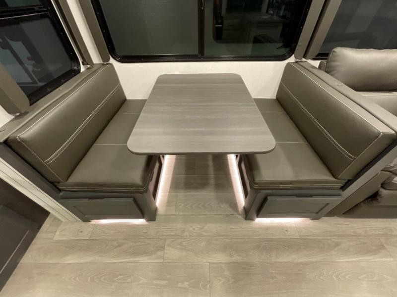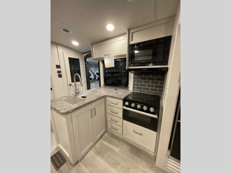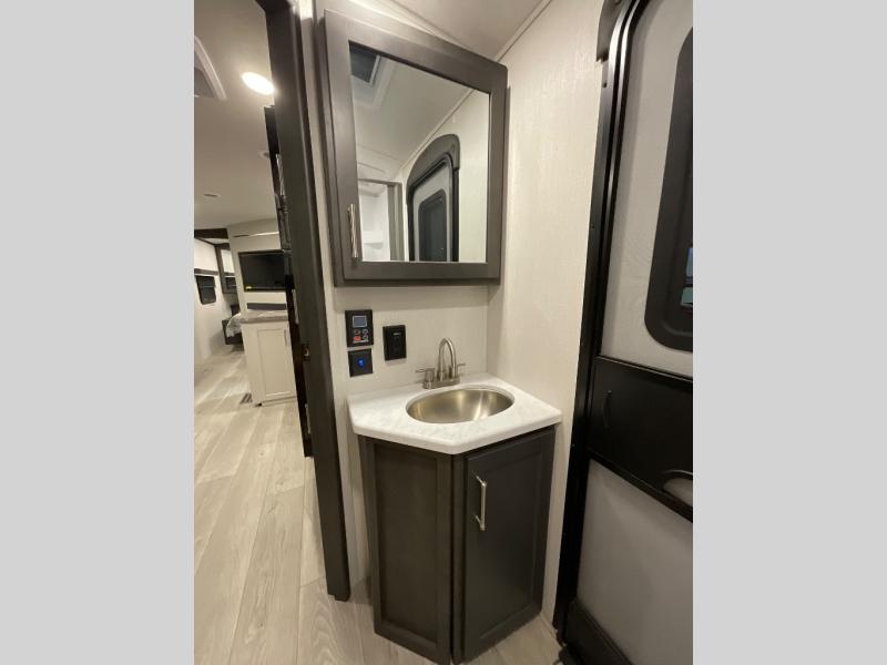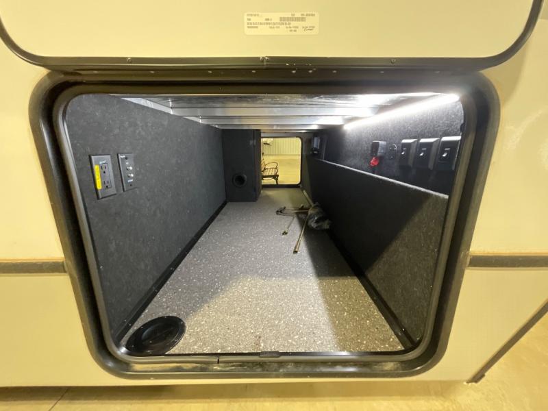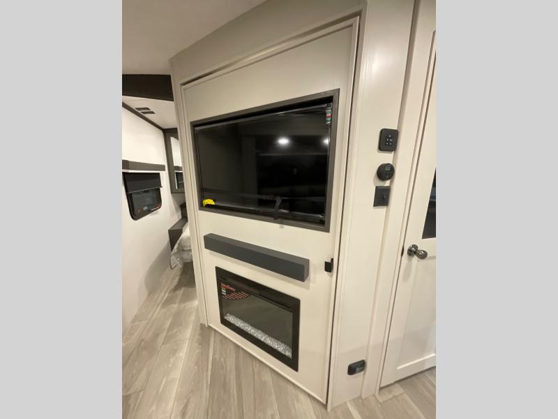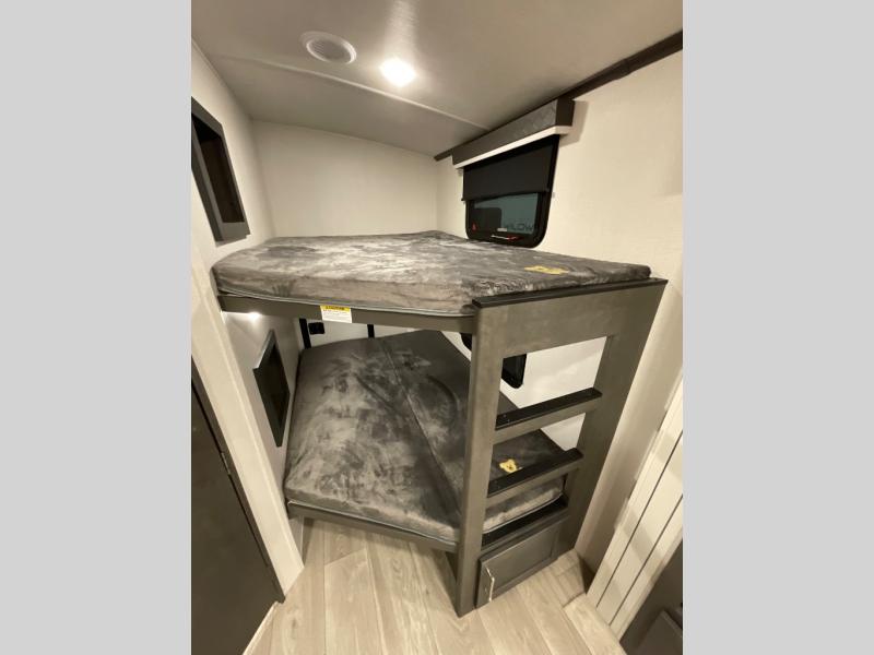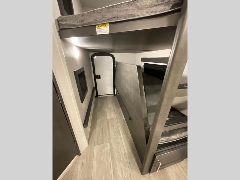 With dual entry doors in this travel trailer, you can enter in through the main living area or the full bath for convenience! Once inside, the sleeper sofa and booth dinette provide places to relax, eat, and play games, plus there is an entertainment center with hidden storage behind to keep movies organized. A full kitchen with a three burner cooktop and 12V refrigerator will allow you to cook and store food, or you can head outdoors to cook on the outdoor kitchen. There is also drop-frame storage outside for fishing poles and hiking gear, and the 21' electric awning provides shade as you relax. When it's time to call it a night, the king bed in the front private bedroom is sure to bring comfort, while the little ones take the double-size bunks, and any other guests can sleep on the living room furniture!