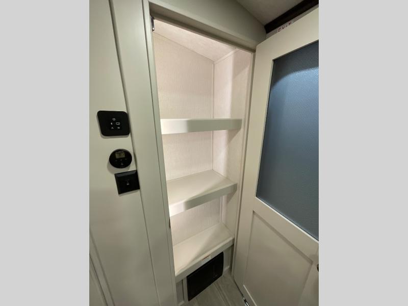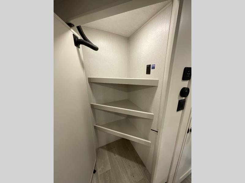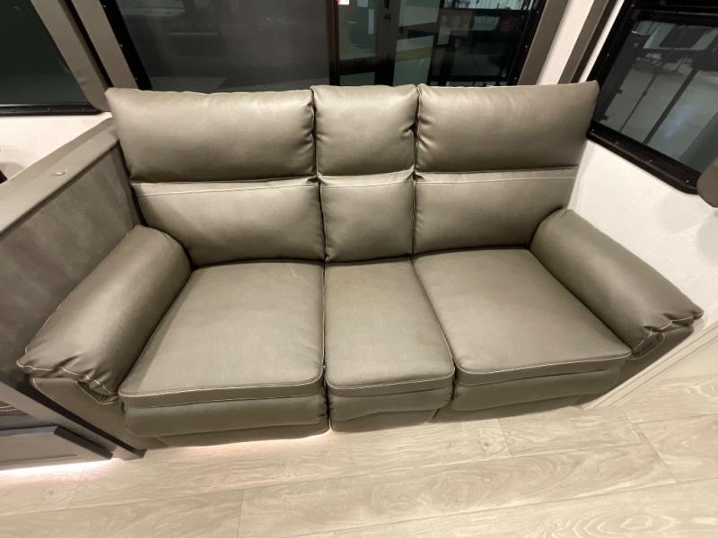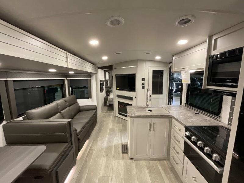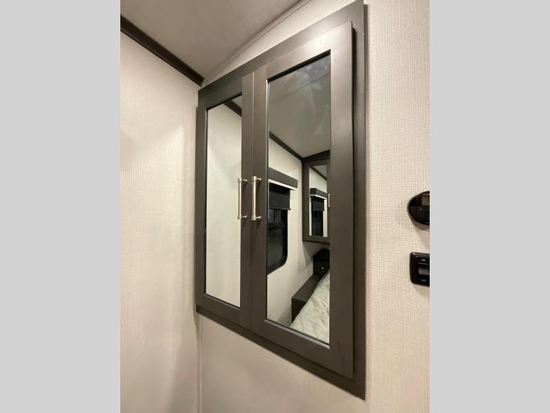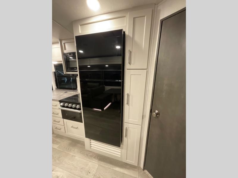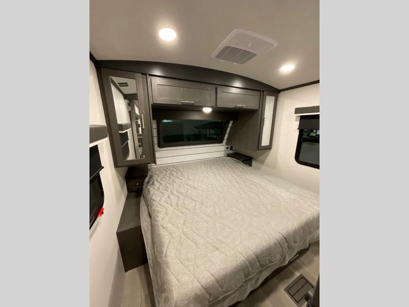 With dual entry doors in this travel trailer, you can enter in through the main living area or the full bath for convenience! Once inside, the sleeper sofa and booth dinette provide places to relax, eat, and play games, plus there is an entertainment center with hidden storage behind to keep movies organized. A full kitchen with a three burner cooktop and 12V refrigerator will allow you to cook and store food, or you can head outdoors to cook on the outdoor kitchen. There is also drop-frame storage outside for fishing poles and hiking gear, and the 21' electric awning provides shade as you relax. When it's time to call it a night, the king bed in the front private bedroom is sure to bring comfort, while the little ones take the double-size bunks, and any other guests can sleep on the living room furniture!