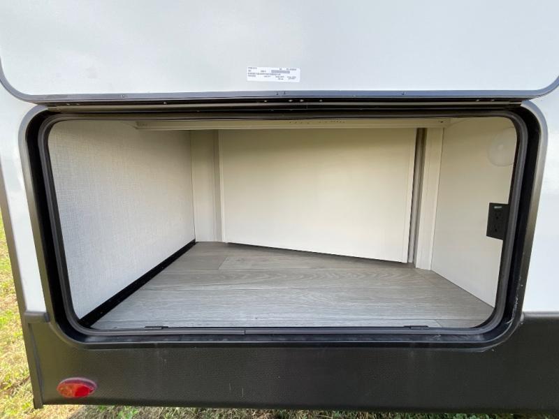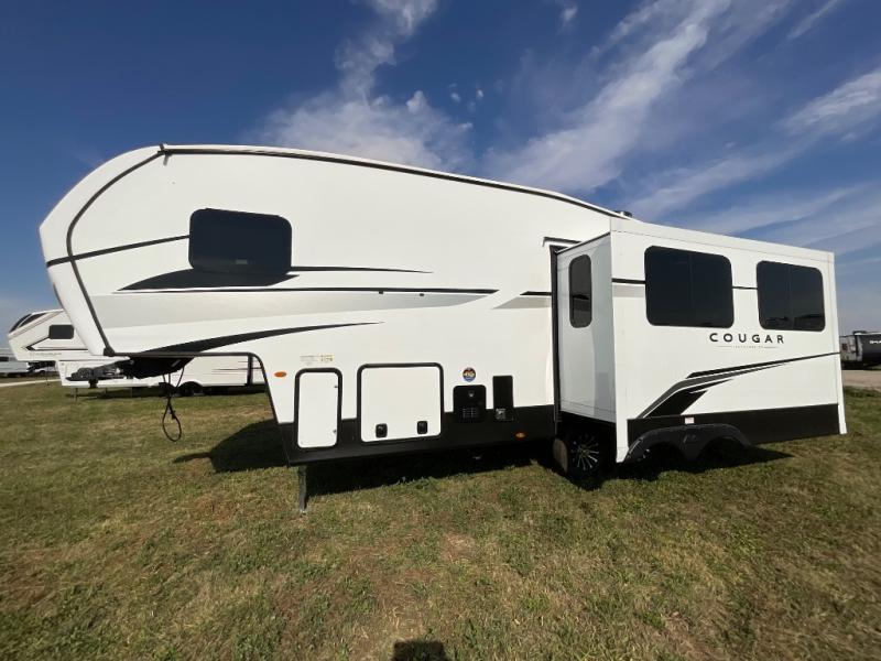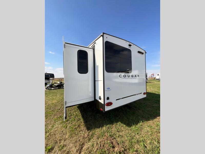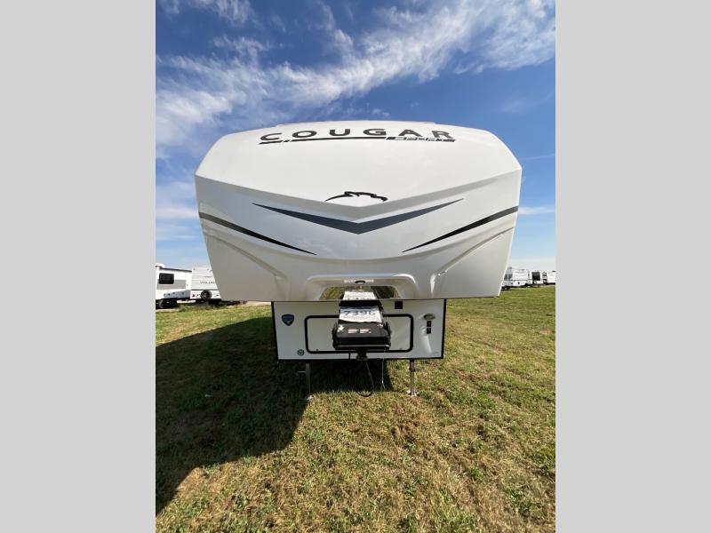 The Cougar Sport structural I-beam frame with stamped steel cross-members and outriggers, plus its laminated sidewalls with five-sided aluminum superstructure and Alpha Super Flex roof membrane are what active RVers love about the construction of the Cougar line. The Cougar Sport models are no exception when it comes to a great package, as well as being smaller and lighter weight than their big brother Cougar models. A one-piece, heated and enclosed polypropylene underbelly means a longer camping season. On the inside, residential shaker style hardwood cabinet doors and decorative crown molding, plus seamless pressed countertops and an on-demand water heater will make your unit feel even more like home. You are also sure to appreciate the shiplap style decorative accent wall behind the bed, a porcelain foot flush toilet in the bathroom, plus residential kitchen hardware, and so much more.