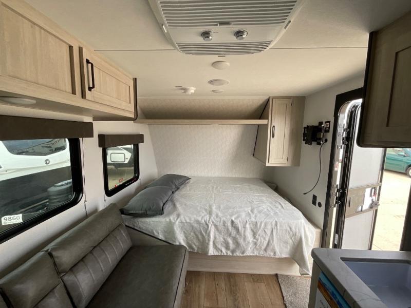 It will be so easy to enjoy camping trips in this single axle travel trailer! There is a front RV queen bed with flip-up storage at the foot of the bed for your belongings, and any additional guests can sleep on the bunk beds and sofa. A full kitchen includes a stainless two burner cooktop and stainless microwave to cook meals each day, and the 4.3 cu. ft. 12V black glass refrigerator will keep your food fresh. And a private bath with a toilet and shower will let you freshen up without having to use the camp's facilities!