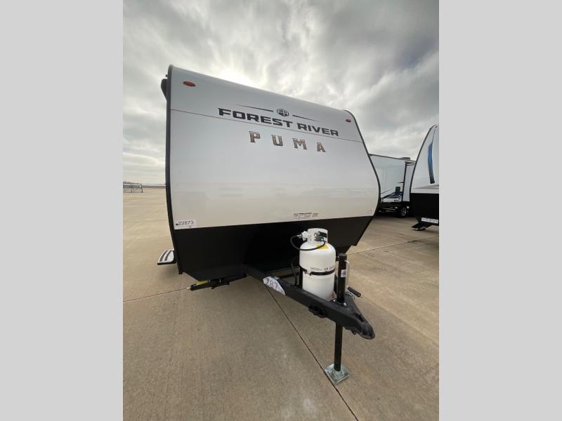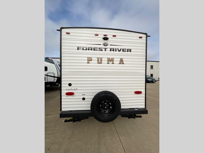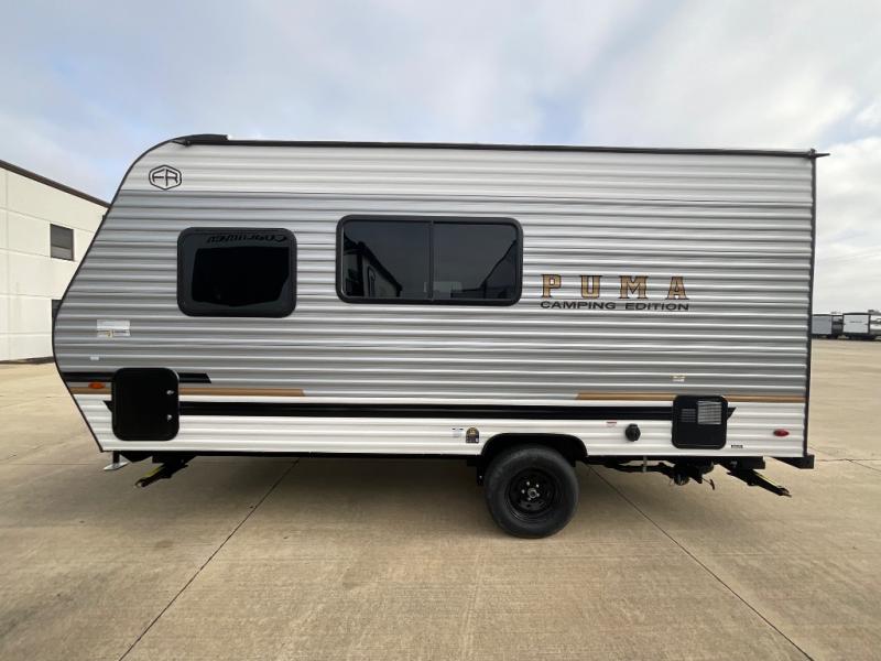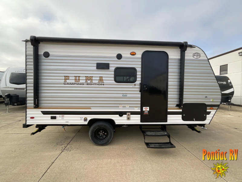 The Puma Camping Edition by Palomino offer an affordable travel trailer for rookie campers or seasoned RVers! They are built with 5/8" tongue and groove plywood flooring and a front diamond plate for added protection. There are also exterior clamp style door latches, back up camera prep, and 20 lb. LP bottles. Head inside to find Thermofoil countertops with a smooth drop edge, bedroom USB ports and outlets, and a GE appliance and kitchen package.