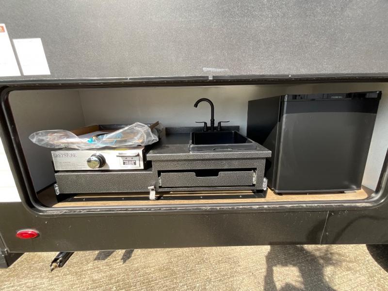 If you're looking for more space, this double axle unit features a large slide so you can walk about freely. Here, you'll find the booth dinette and sofa, which sit across from the optional TV if you want to enjoy movie nights. The full kitchen includes a stainless microwave and three burner cooktop to make meals, plus a pantry and 12V refrigerator for food storage. And an optional outside kitchen with a griddle can be added if you enjoy cooking outdoors! The kids or your guests will love the double-size bunks, and the full bath right beside the bunks includes a shower a seat for added comfort.