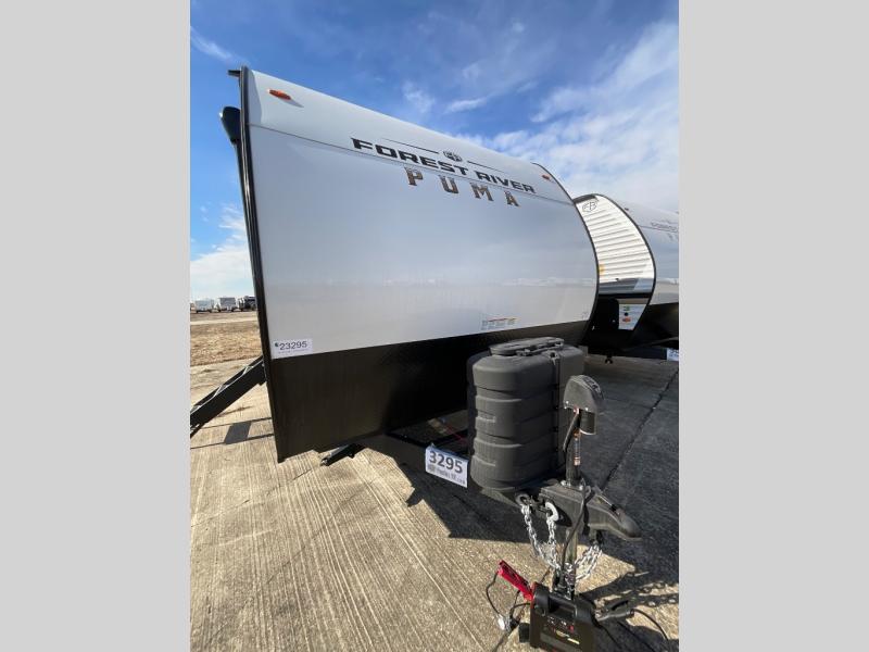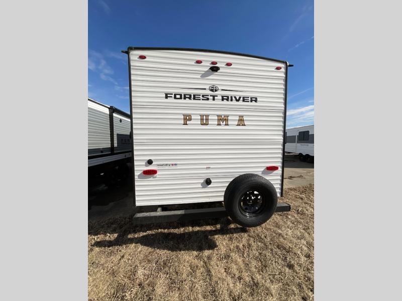 The Puma Camping Edition by Palomino offer an affordable travel trailer for rookie campers or seasoned RVers! They are built with 5/8" tongue and groove plywood flooring and a front diamond plate for added protection. There are also exterior clamp style door latches, back up camera prep, and 20 lb. LP bottles. Head inside to find Thermofoil countertops with a smooth drop edge, bedroom USB ports and outlets, and a GE appliance and kitchen package.