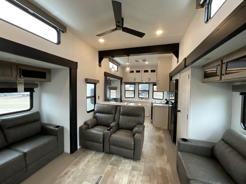This is the perfect destination trailer for a larger group since it can sleep up to nine campers each night. The little ones will love the double loft areas with three bunk mats and storage space for their things, while you take the rear private bedroom. There is a king bed slide out here, along with a wardrobe/closet for your clothes, plus a second closet with the option to add washer and dryer prep. Everyone can meet in the middle living room to relax on the dual sofas or recliners across from the fireplace and entertainment center. Head to the front of the unit where you'll find the kitchen that includes ample counter space to prep meals, a residential style refrigerator and pantry for food storage, and a free-standing table to dine at. There is also a breakfast nook that overlooks the living area so you can visit with the cook and watch a movie at the same time!