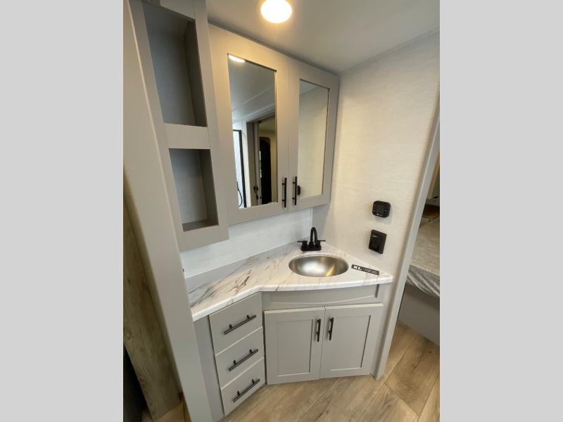 You'll love camping in this rear kitchen travel trailer with generous counter space and overhead storage for spices, dishes, and more. You can dine each day at the booth dinette or relax on the sofa slide out, which will provide more floor space. The spacious walk-thru bath includes a 30" x 36" shower, toilet, and vanity so you can clean up each day. Head to the front master bedroom where you can sleep soundly on the walk-around queen bed with dual nightstands and wardrobes. The second entry door is also found in this room so you can slip out for an early morning run!