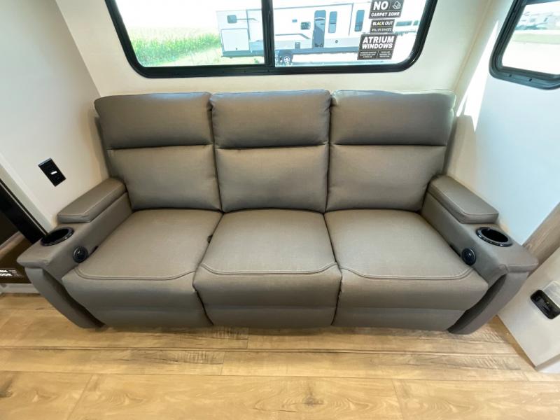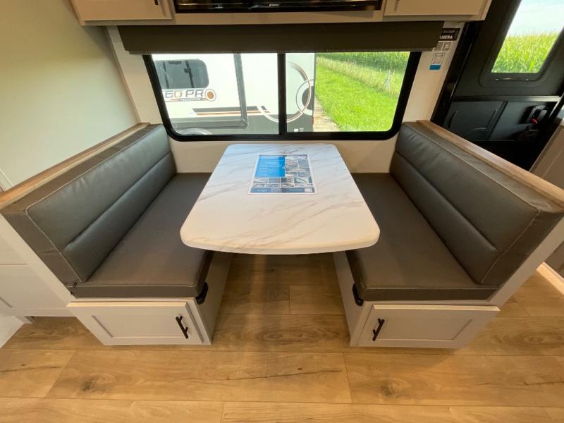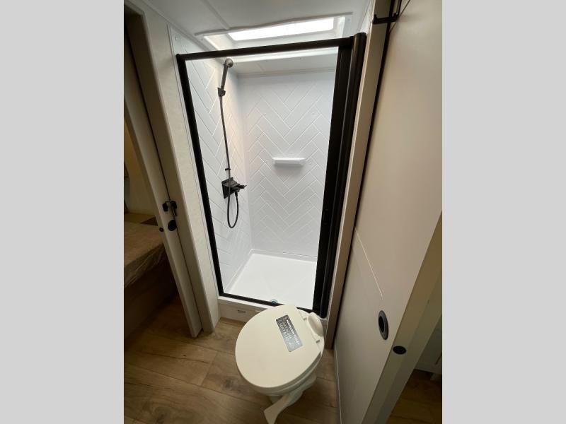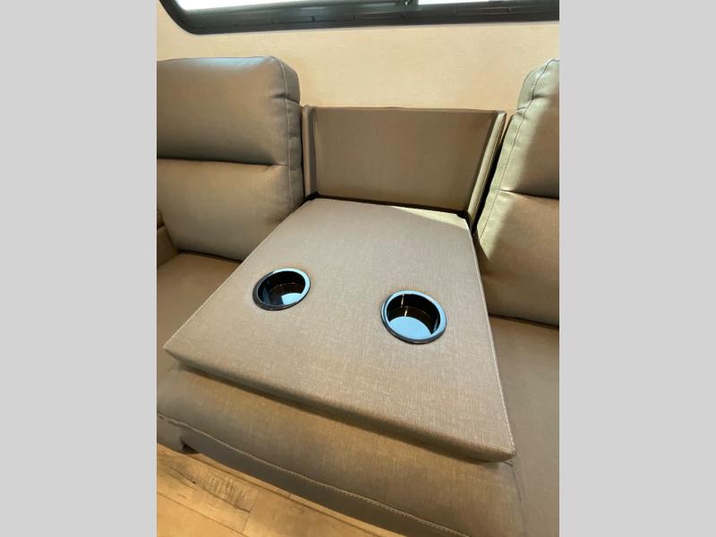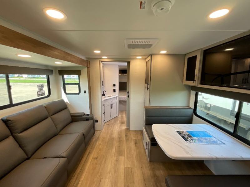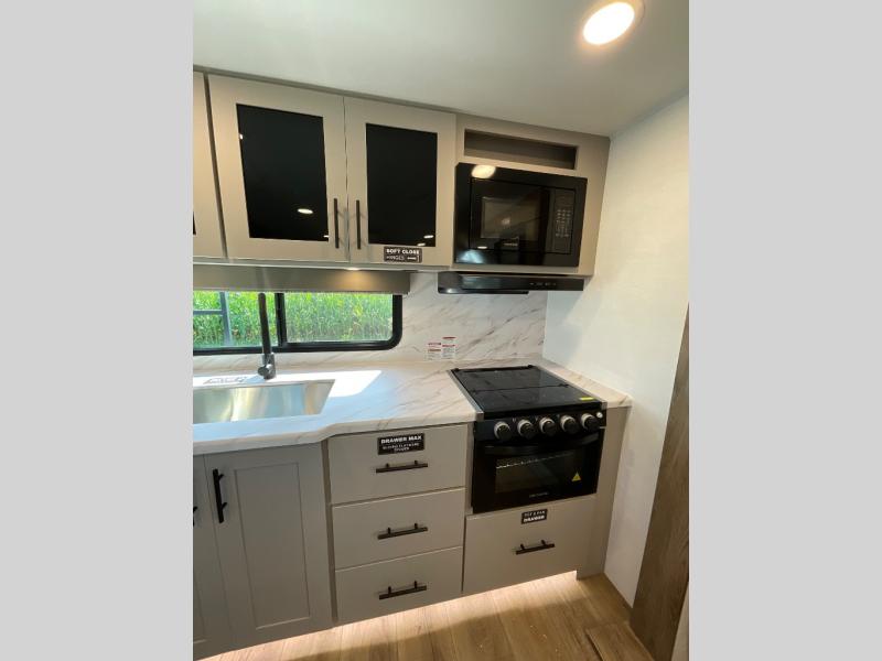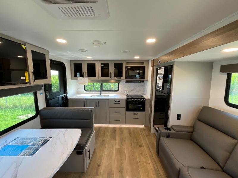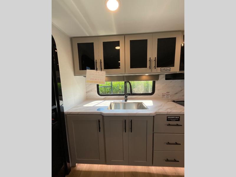 You'll love camping in this rear kitchen travel trailer with generous counter space and overhead storage for spices, dishes, and more. You can dine each day at the booth dinette or relax on the sofa slide out, which will provide more floor space. The spacious walk-thru bath includes a 30" x 36" shower, toilet, and vanity so you can clean up each day. Head to the front master bedroom where you can sleep soundly on the walk-around queen bed with dual nightstands and wardrobes. The second entry door is also found in this room so you can slip out for an early morning run!